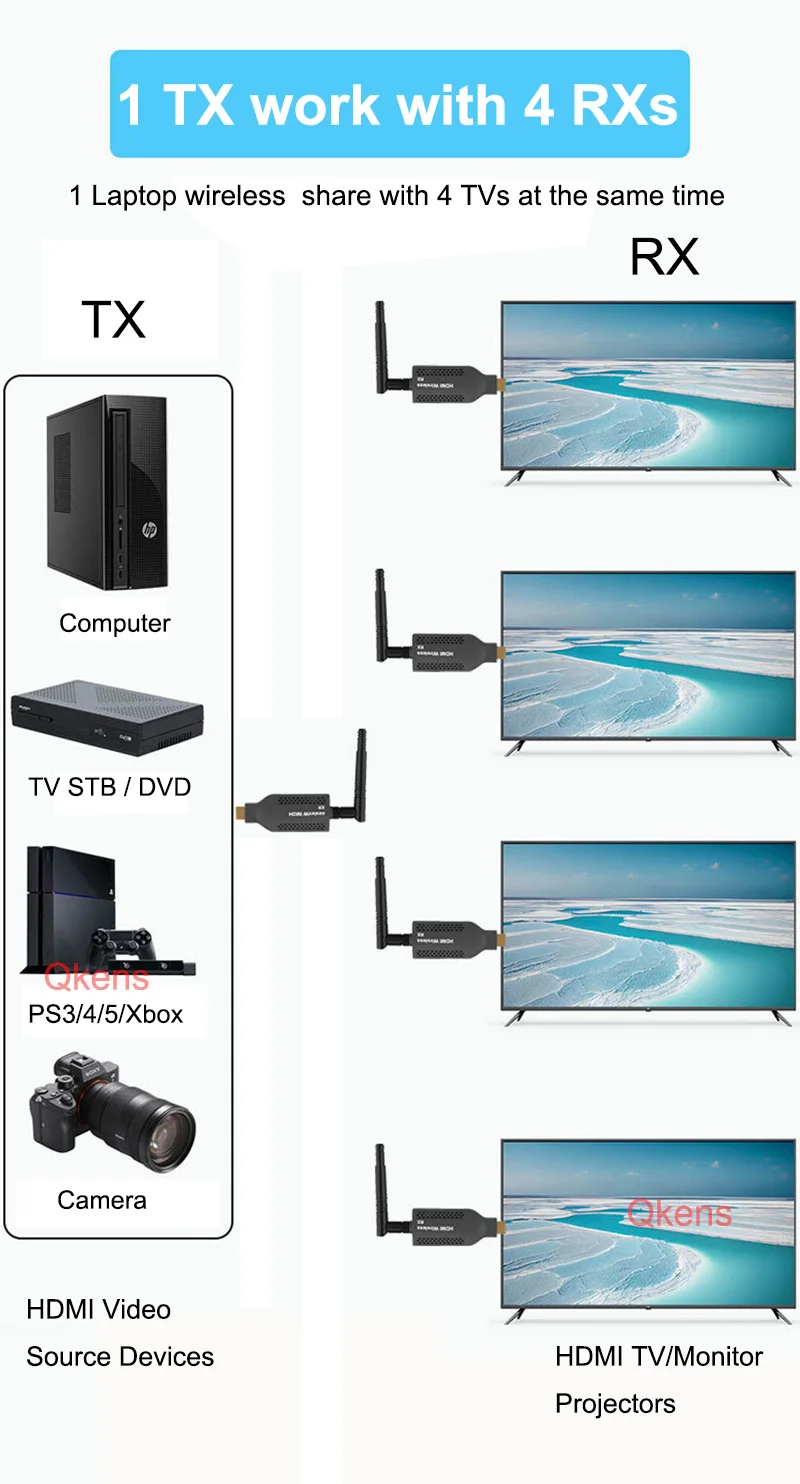 Consejos cálidos:1. Nuestro producto tiene una versión NUEVA mejorada, es más potente, ¡compre con confianza!2.Con el aumento de RX, la distancia de transmisión inalámbrica se acortará en consecuencia.La distancia final estará sujeta al uso real. Utilice este producto en un espacio libre de barreras.No puede atravesar paredes ni barreras, si necesita atravesar barreras, contáctenos para recomendarle.1.Introducción:TX es para transmisor, RX es para receptorEste protocolo de transmisión inalámbrica incorporado del extensor HDMI puede transmitir de forma inalámbrica señales de audio y vídeo HD,Al mismo tiempo, el equipo tiene una excelente capacidad de transmisión y procesamiento de imágenes, emite señales.La transmisión es más suave y estable, es un tipo de forma económica y eficiente de extensión de señal HDMI.Es ampliamente utilizado para videoconferencias en pantalla grande/entretenimiento en el hogar/aprendizaje en línea/disco empresarial.entrenamiento educativo/juego, etc.más impactante, más relajante y es mejor para proteger los ojos.2.Características:1.Transmisión de audio y vídeo HDMI a través del protocolo de transmisión inalámbrica incorporado, sin necesidad de wifi ni Internet2.HDMI 1.1, compatible con HDCP1.2;3.Admite entrada y visualización Full HD 1920x1080@60Hz;4.La transferencia es eficiente para garantizar que la reproducción fluya;5.Sistema de equilibrio automático incorporado, la imagen es fluida, clara y estable;6.El circuito de protección electrostática ESD incorporado, sistema integral de protección de seguridad;7.Instalación simple y conveniente, plug and play, no es necesario configurarla.La distancia final estará sujeta al uso real.9.Mini portátil, fácil de llevar, llevar con usted, úselo en cualquier momento, muy conveniente.Contenido del paquete la opción " 1 TX y 1 RX ":1.Transmisor HDMI de 150M------------------------------------------------1 unidad2.Receptor HDMI de 150M------------------------------------------------1 unidad3.Cable de extensión HDMI--------------------2 uds.4.Cable de alimentación USB C-----------------------------------------------2 uds.5. Manual de usuario------------------------------------------------------1 unidadSi elige otras opciones, vendrá el RX en consecuencia.Viene con caja de venta al por menor y otros accesorios, si es necesario, contáctenos antes de comprar.