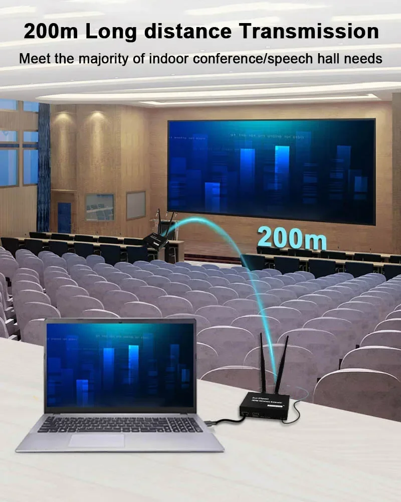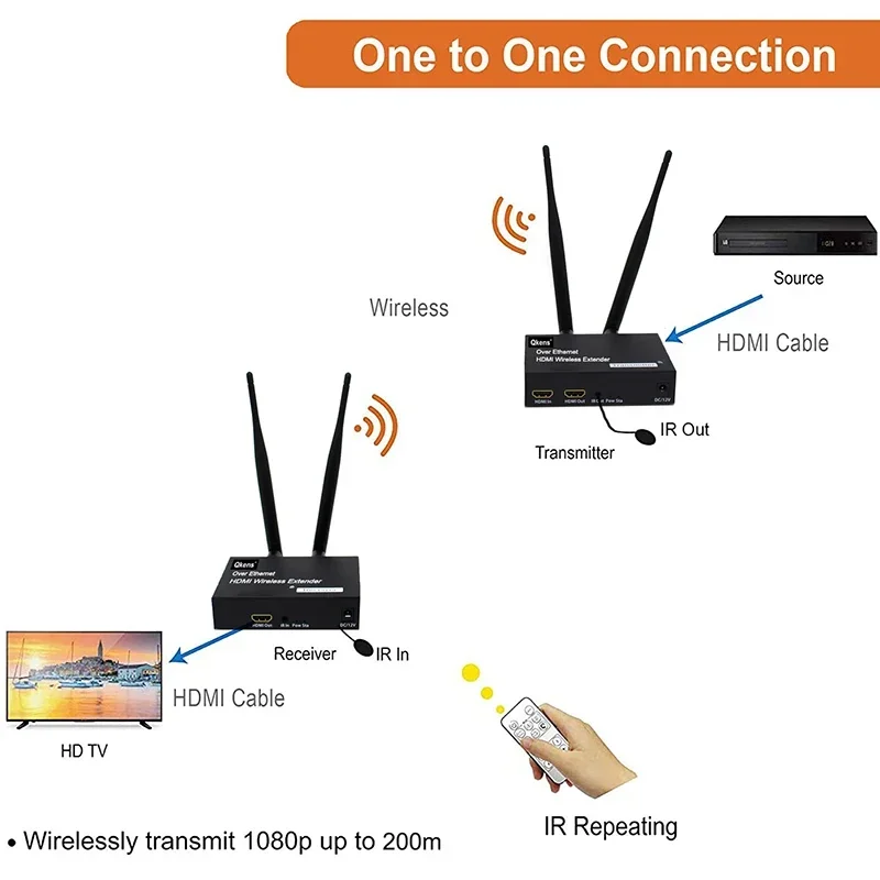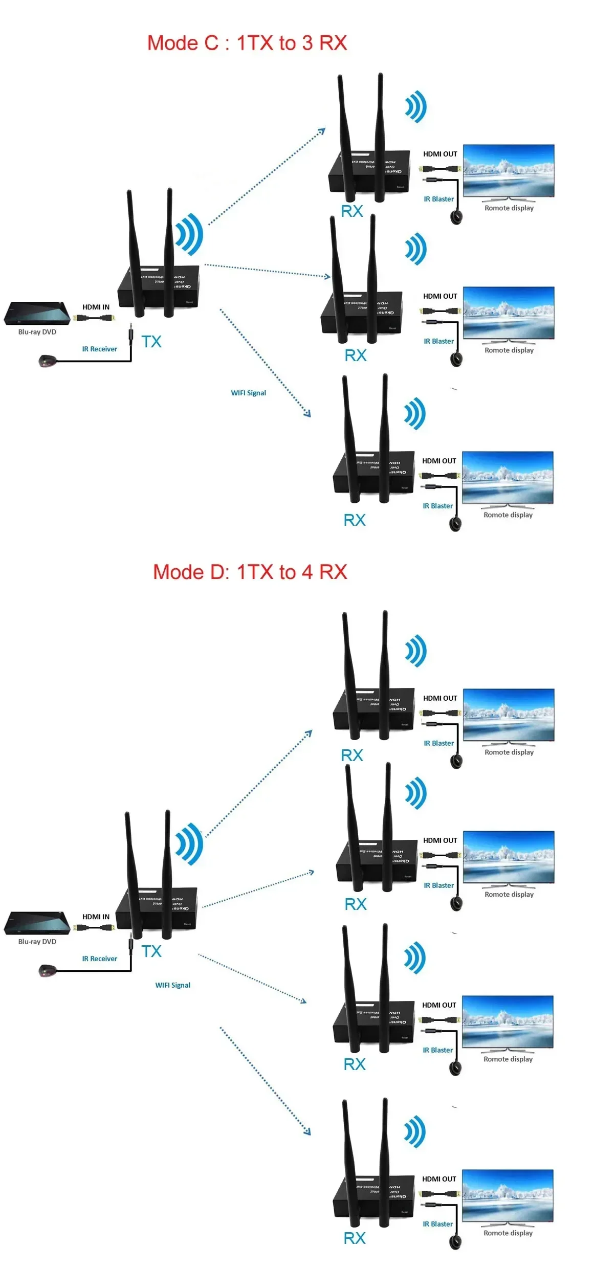 Señales a través del protocolo de transmisión inalámbrica incorporado, admite hasta 200m bajo el Modo 1 TX a 1 RX