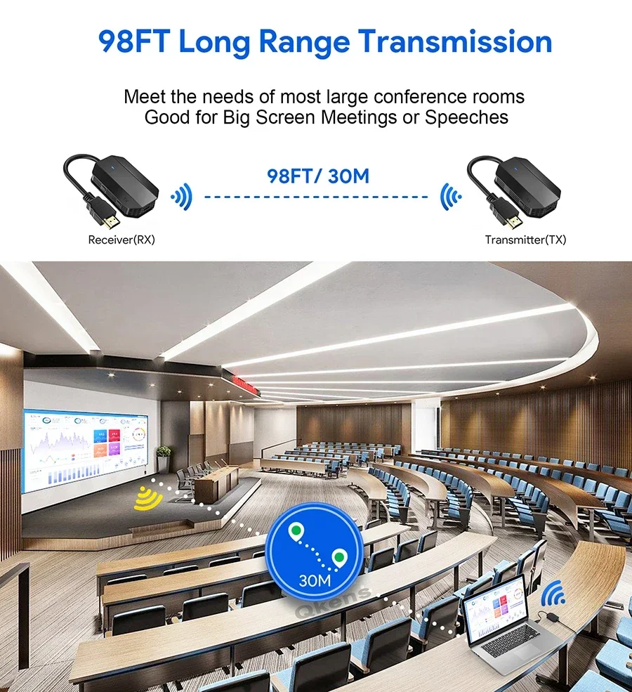 1.Transmisión de vídeo y audio HDMI a través del protocolo de transmisión inalámbrica incorporado, hasta 30 metros.