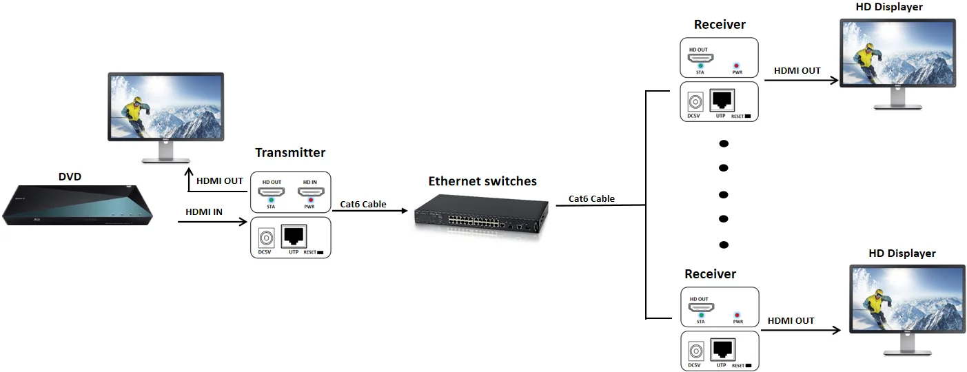 esto funciona de maravilla. Lo conecté a un conmutador Gigabit de 5 puertos, conecté los cables HDMI y Cat6 y funcionó de inmediato. El vendedor envió muy rápido.