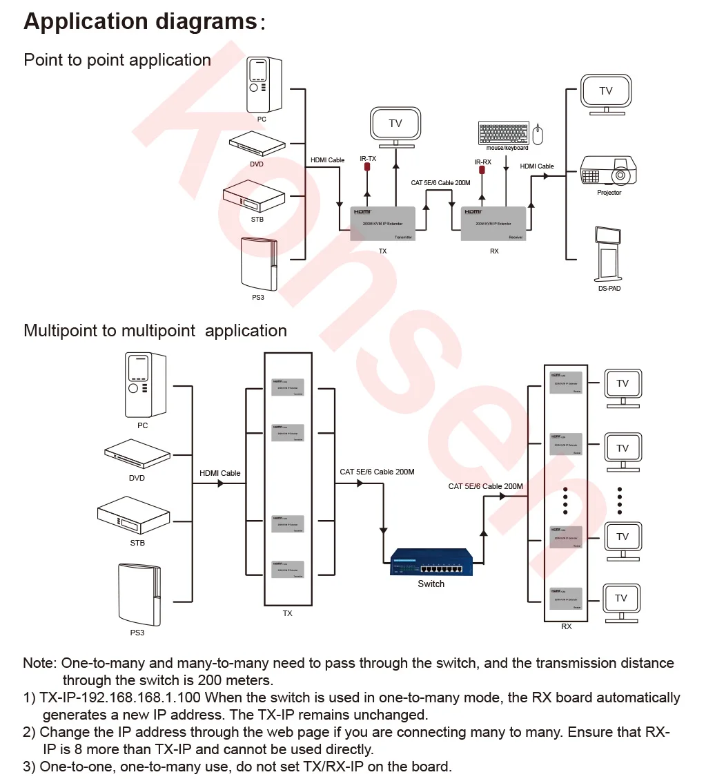El extensor HDMI IP de 200M se basa en el estándar TCP/IP. Transmite su pantalla HD con la alta resolución hasta 200 metros de distancia de su DVD o fuente de ordenador mediante el uso de un cable CAT5e/6. Al mismo tiempo, es conveniente transmitir la fuente de audio y video HDMI por modo punto a punto, punto a multipunto, modo multipunto a multipunto y modo de conexión en cascada.