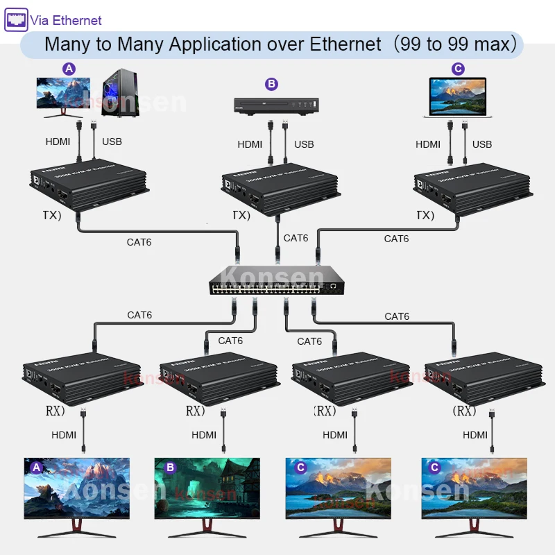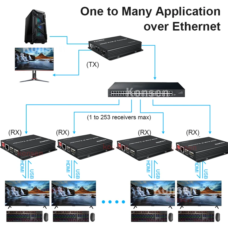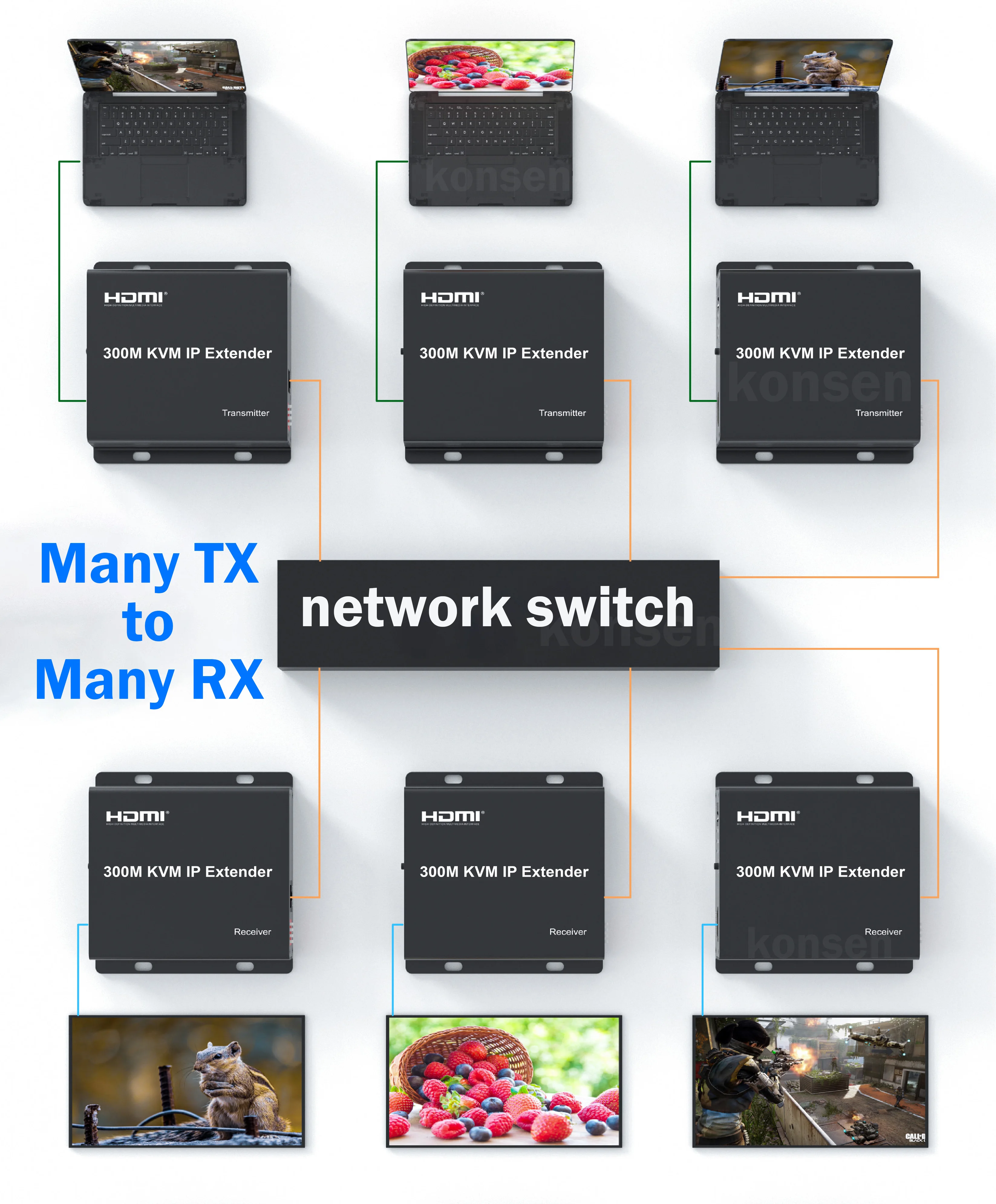 El extensor IP HDMI de 300M se basa en el estándar TCP/IP. Transmite su pantalla HD con la alta resolución de hasta.
