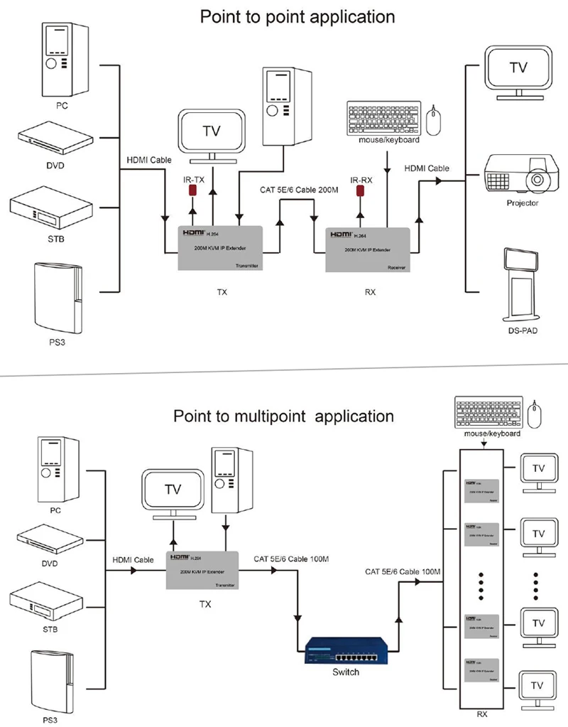 Este extensor KVM H.264 200M sobre IP se basa en el estándar TCP/IP. Transmite la pantalla HD con el alto