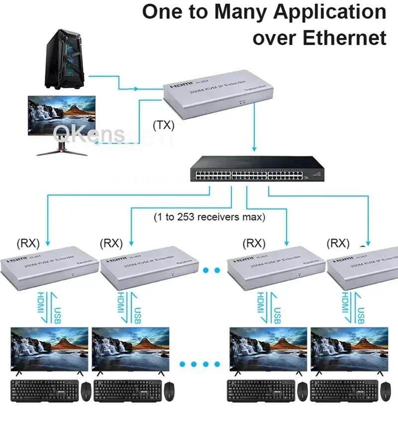 Este extensor KVM H.264 200M sobre IP se basa en el estándar TCP/IP. Transmite la pantalla HD con el alto