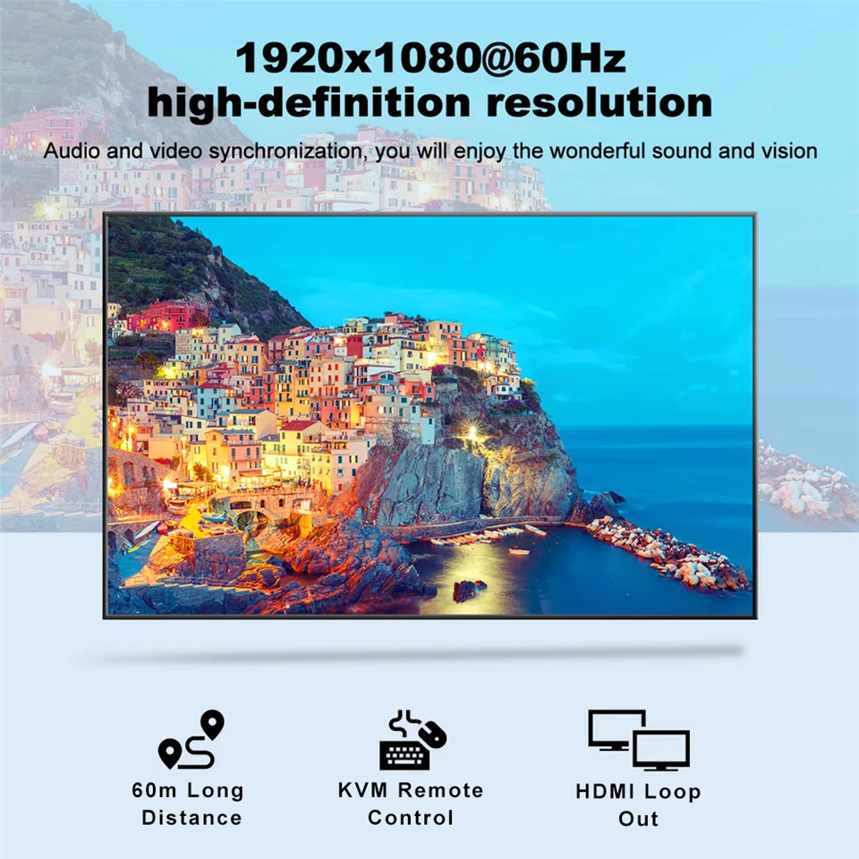 KVM Extender HDMI RJ45 1080P HDMI Extender CAT5 60M HDMI Extender Audio Kit sobre Ethernet Cat6/5E para PS4 Apple TV PC portátil HDTV