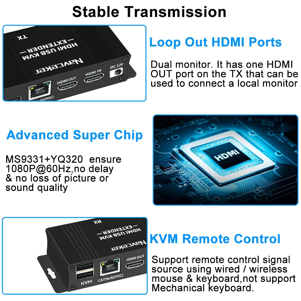 El extensor HDMI Navceker proporciona una extensión de señales HDMI de larga distancia a través de un solo cable CAT5e/6, compatible con alta resolución de hasta 1920x1080 a 60Hz, POC, salida HDMI y control remoto KVM. El extensor se puede utilizar para una amplia gama de aplicaciones que requieren transmisión a larga distancia de alta resolución con alta calidad por su buena estabilidad y potente seguridad.