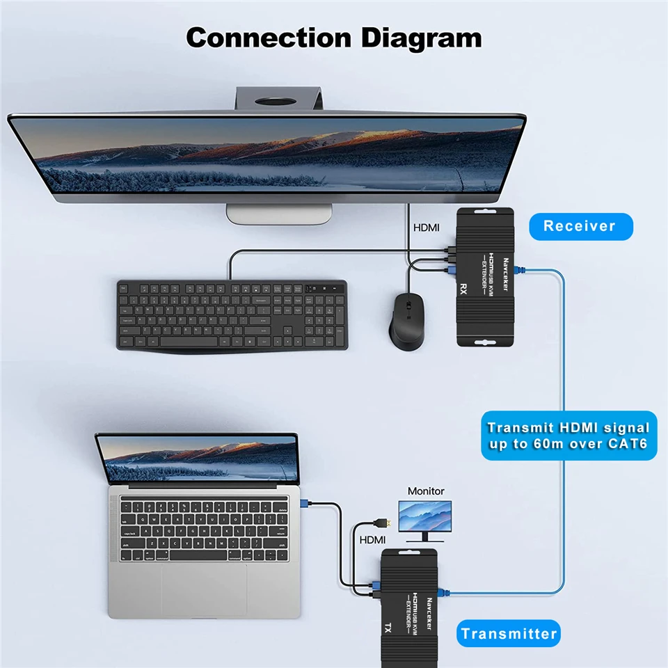 Comprar Extensor HDMI KVM RJ45, USB, 60m sobre Cat5e/Cat6 POC, transmisor de ratón, receptor para PC y ordenador, 2024