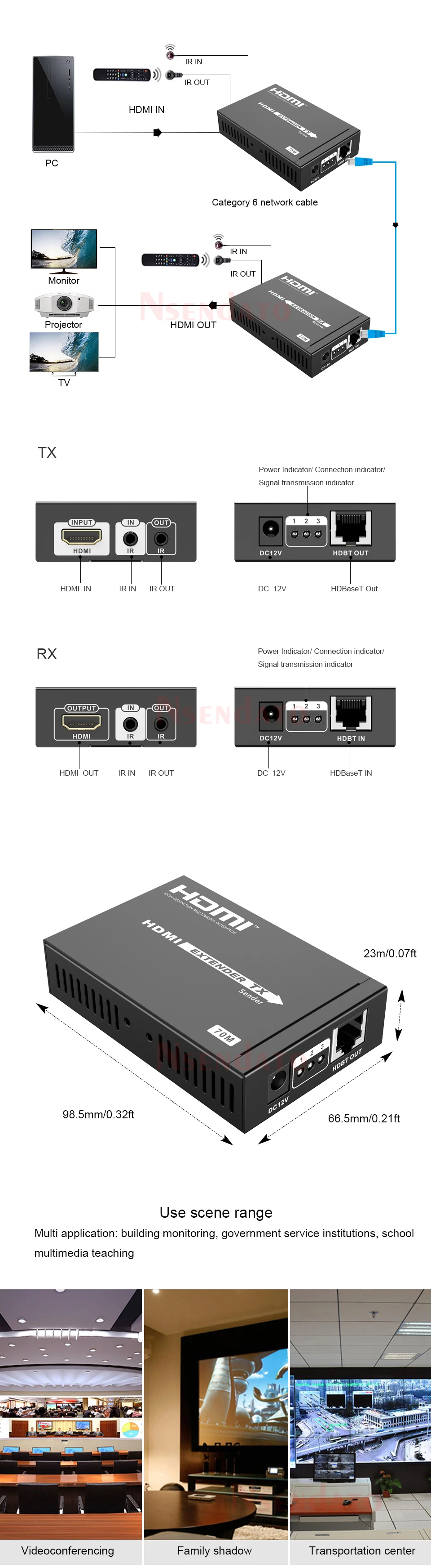 Descripciones:Nsendato HDMI Extender sobre cat5e/cat6 es una herramienta para extender su señal HDMI a largas distancias a una pantalla compatible.Está diseñado para convertir la señal HDMI en señal HDBaseT estándar y transmitir mediante cable de Internet.También admite transferencia de señal de control infrarrojo bidireccional junto con la señal HDMI, por lo que puede controlar la fuente en el lado del fregadero que está a 70 metros en el exterior, y también puede controlar el fregadero en el lado de la fuente que está a 70 metros en el exterior usando el extensor HDMI.(extensor HDMI con IR)Características:Incorpora tecnología de extensión HDbaseTTransmita señal HDMI sin comprimir a través de un cable CAT5e/6a/7Admite Full HD 1080p@60Hz, 3D, 4Kx2K@30HzDistancia de soporte de hasta 230 pies (70 metros) con CAT6a/7Admite la función de retorno IR bidireccionalSoporte para HDCP, CEC, 24 colores profundosAdmite audio LPCM sin comprimir y DTS-HD comprimido, Dolby True HDEspecificación:Señal HDMI: compatible con HDCP; admite CEC y 24 bits de color profundoResolución admitida: 480i@60Hz, 480p@60Hz, 576i@50Hz, 576p@50Hz, 720p@50/60Hz, 1080i50/60Hz, 1080p50/60Hz, 3D, 4Kx2K@24/25/30/60HzAudio: soporte para LPCM, DTS-HD, Dolby True HDCable de red: Cat5e/6a/7Distancia de transmisión:CAT5E: 60 m hasta 1080p@60Hz 36pp; 35 m hasta 1080p@60HZ 488bpp, 1080p@60Hz 3D, 4Kx2K 30Hz; 4Kx2K 60Hz (4; 2:0);CAT6:70m hasta 70m 1080p@60Hz 36bpp;40m hasta 1080p@60HZ 48bpp,1080p@60HZ 3D,4Kx2K@30HZ;4Kx2K 60Hz(4;2:0)CAT7: 40M hasta 1080p@60HZ 48bpp, 1080p@60HZ 3D, 4Kx2K 30HZParte posterior infrarroja: admite dispositivos de frecuencia de 20 ~ 60 kHz y transmisión IR bidireccionalLista de paquetes:Transmisor extensor HDMIReceptor extensor HDMITransmisor IRReceptor IRAdaptador de 12 V CC