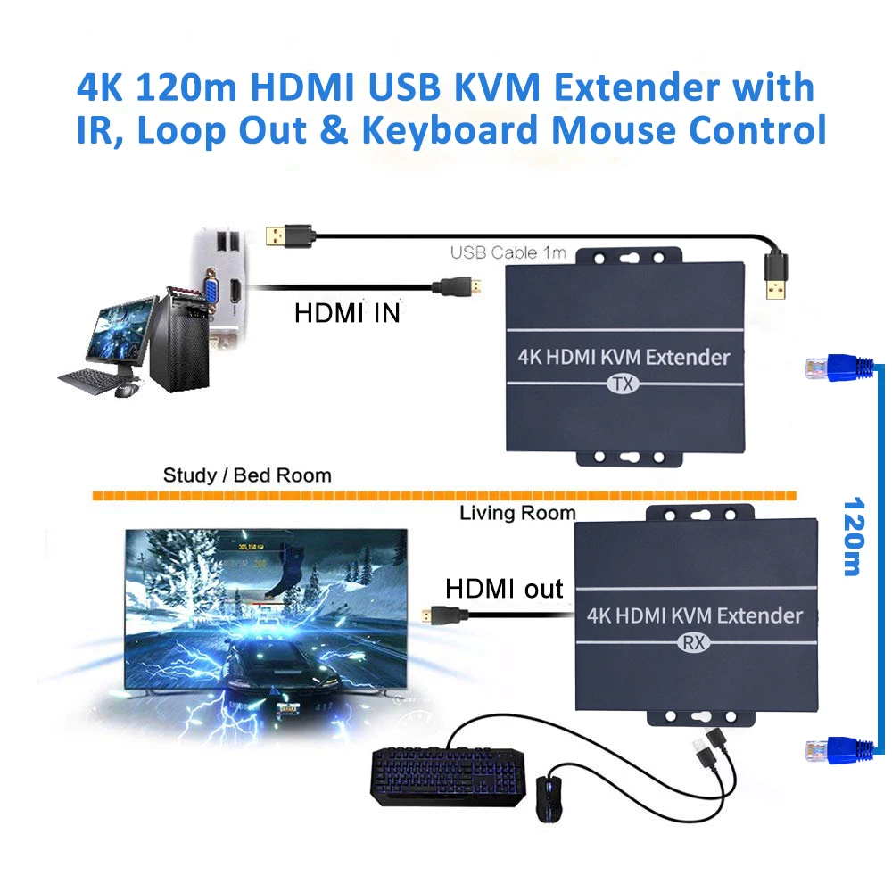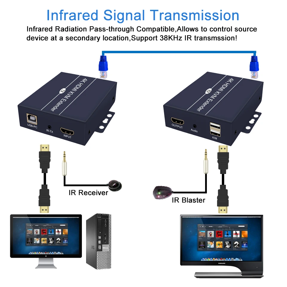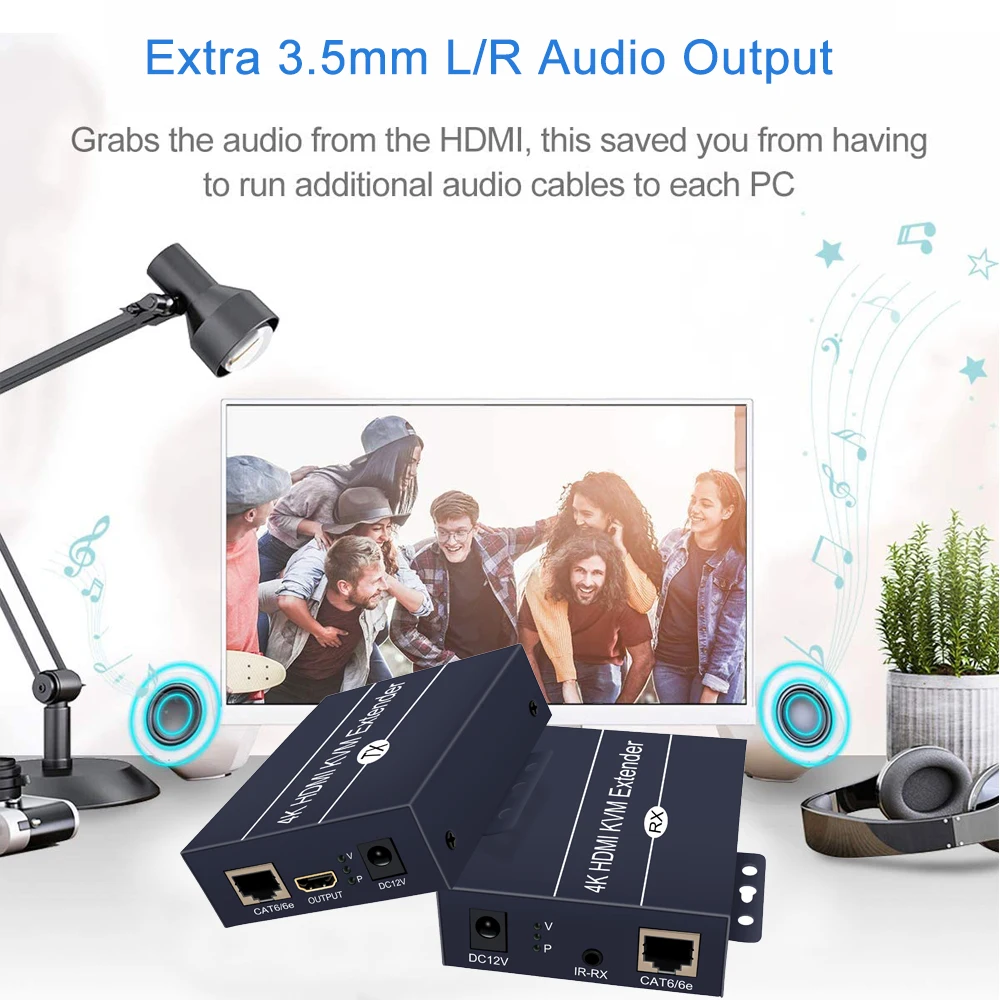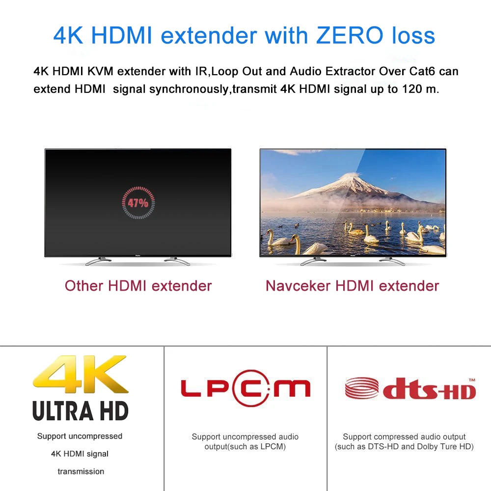 El extensor HDMI Navceker 4K proporciona una extensión de señales HDMI de larga distancia a través de un solo cable CAT5e/6, admite alta resolución de hasta 4K x 2K @ 30Hz, control KVM,. Salida de audio de 3,5mm, salida de bucle HDMI y transmisión de señal IR unidireccional de 38 KHz. El extensor se puede utilizar para una amplia gama de aplicaciones que requieren transmisión a larga distancia de alta resolución con alta calidad por su buena estabilidad y potente seguridad.
