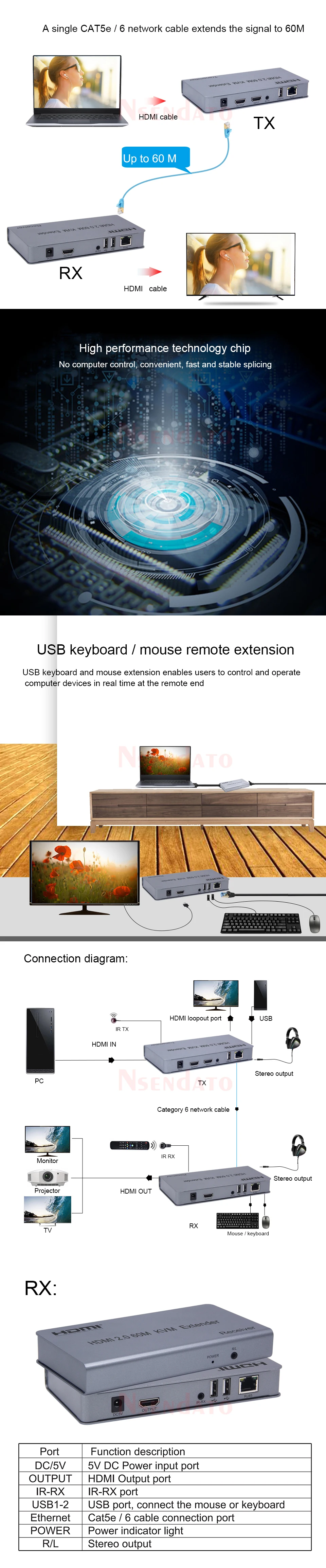 Extensor HDMI RJ45 4K 60Hz 60m KVM HDMI Extender con USB KVM HDMI sobre Cat6 HDMI KVM Ethernet Extender para teclado de ratón USB