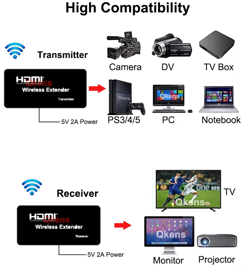 CaracterísticasSoporte HDCP1.3;Compatible con IEEE802.11a/B/g/n estándar;Soporta la tasa más alta 1.485G y reloj TMDS de hasta 148,5 Mhz;Trabajando en banda de frecuencia 2,4G/5G, no molesta fácilmente a las señales inalámbricas;La distancia más larga puede ser de 150m en espacio abierto sin barreras