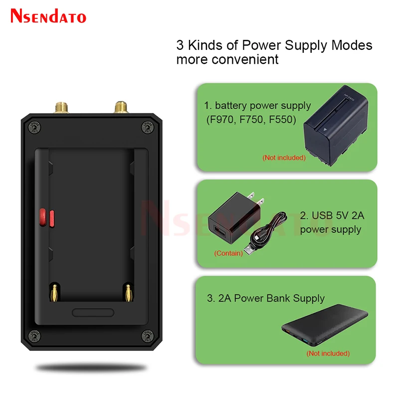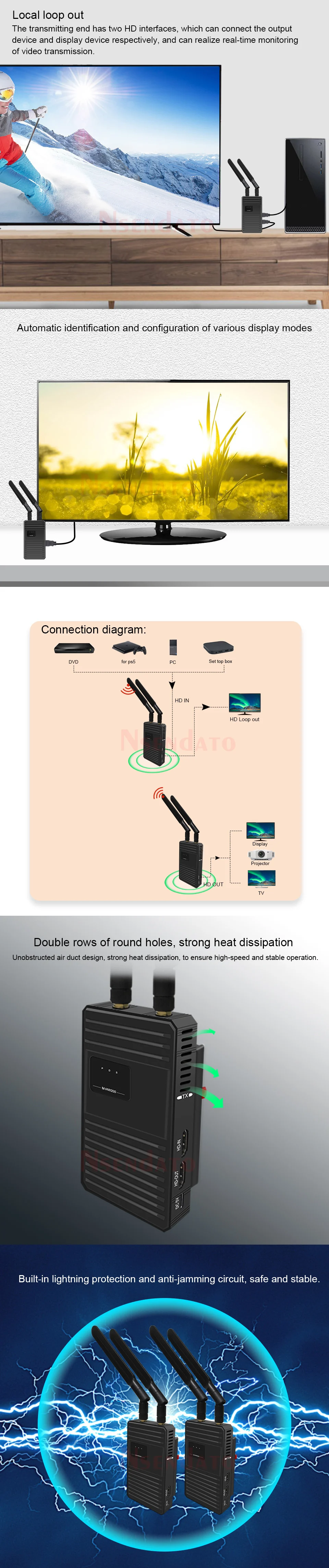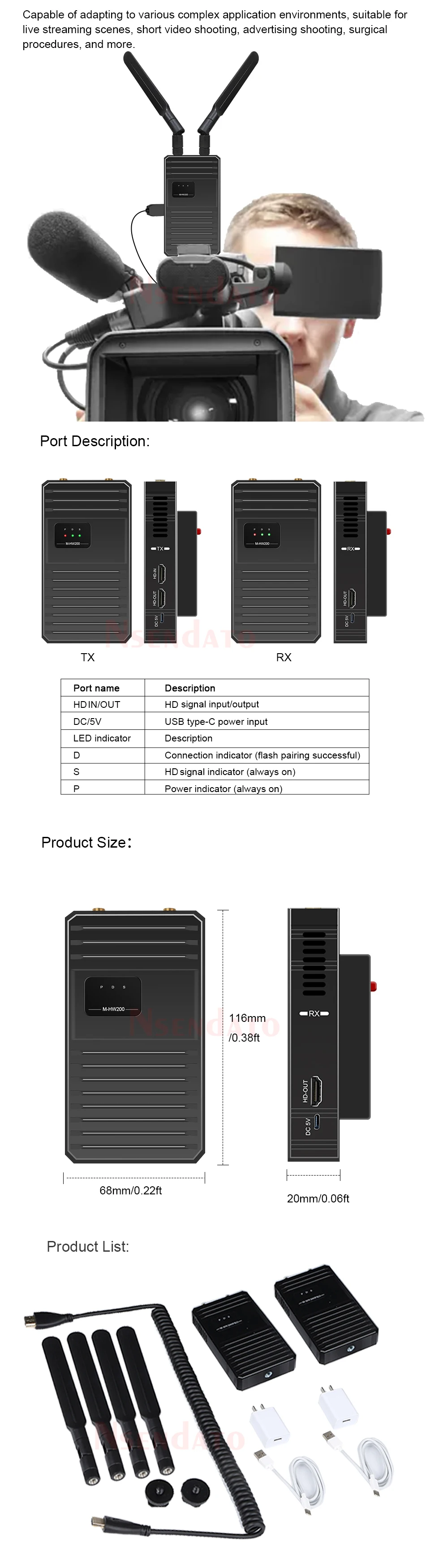 Señaló:1. La descripción para el conjunto completo, pero tenemos tres opciones, una es solo para el transmisor, una es solo para el receptor, la otra es un conjunto completo con rx (receptor) TX (transmisor), el Dispositivo de un transmisor con cuatro receptores, ¡para que pueda seleccionar lo que desee!2. El juego completo estará empaquetado con una buena bolsa, pero la bolsa se quitará si solo tienes un transmisor o un receptor, usaremos la caja para ello si solo seleccionas a través de un único transmisor o receptor.3. El dispositivo tiene un retraso de 0,1-3 segundos, no realice el pedido si no puede aceptar el tiempo de retraso.4, póngase en contacto con nosotros si tiene algún problema, haremos todo lo posible para ayudarle después de recibir su mensaje5. El modelo tiene dos versiones, versión CC con adaptador CC, versión de batería compatible con batería y adaptador CC, así que seleccione el tipo necesario.6. La descripción con la versión de la batería, por favor contáctenos si necesita más información sobre la versión normal.7. Sobre la batería: necesita obtenerla en su mercado local si seleccionó la versión de la batería (la batería NO recomiendo: F960 y F970 ), nuestro paquete NO incluye la batería debido a la forma de envío.8. La descripción es solo para la versión de la batería, Contáctenos si tiene algún problema con otra versiónIntroducciónLa transmisión inalámbrica transmite señales de audio y video de alta definición a través de señales inalámbricas de 5,8G, que pueden adaptarse a una variedad de entornos de aplicaciones complejas. El dispositivo tiene excelentes capacidades de procesamiento y transmisión de imágenes, lo que hace que la transmisión de señal sea más suave y estable. Es un modo de extensión de señal Compatible con HDMI confiable, de alto rendimiento y eficiente.Características:1. Transmisor HDMI Compatible con señales de vídeo y audio de más de 5,8G inalámbrico hasta 200m(656 pies)2. Admite Resolución de vídeo de hasta 1920*1080P @ 60Hz3. Admite un TX y un RX, admite un TX y cuatro RX como máximo.4. El formato especial H.264 se utiliza para comprimir y descomprimir el vídeo, mejorar la eficiencia de transmisión y hacer que la reproducción sea más fluida5. Cumplimiento con el estándar Compatible con HDMI V1.3 y Compatible con HDCP 1,26. Alta compatibilidad, puede emparejar automáticamente la fuente y el dispositivo de visualización7. Sistema de protección ESD incorporado8. Fácil de instalar, enchufar y usarProceso de instalación:1. Conecte la fuente de señal Compatible con HDMI al puerto Compatible con HDMI del transmisor2. Conecte el puerto de salida del receptor al HDMI Compatible con dispositivo de visualización (como HD TV, proyector, etc.)3. Conecte las fuentes de alimentación CC/5V proporcionadas a la toma de corriente del transmisor y el receptorDescripción:Estándares de Video: Compatible con HDMI V1.3 y Compatible con HDCP 1,2Formato de compresión: H.264Reloj de píxeles máximo: 165MHzVelocidad de datos máxima: 6,75 GbpsResolución: 1920x1080P @ 60HzConector: Compatible con hdmi-aImpedancia: 100ΩRetardo de transmisión: 0,8 segundosDistancia máxima recomendada de entrada/salida del cable Compatible con HDMI: 5m, cuando 1920*1080P @ 60HzWIFI RF potencia: 21dbmEstándar inalámbrico: 802.11a 、 802.11n 、 802.11acDirección de señal: unidireccionalFrecuencia: 5150 ~ 5250MHz 、 5475 ~ 5850MHzDistancia de transmisión: 200m en ambiente abiertoModo de modulación: Para OFDMAncho de banda: 20MHzPaqueteTransmisorReceptorAntenaAdaptador de corriente (5V 2A)(no incluye la batería)CableManual usuario