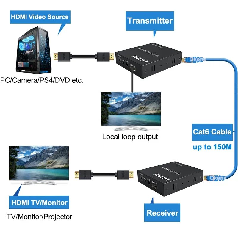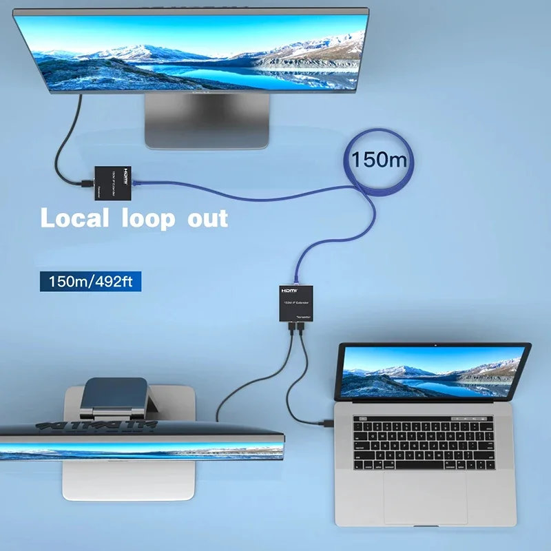 Este extensor IP HDMI de 150 M se basa en el estándar TCP/IP.Transmite tu pantalla HD con alta resolución hasta 150 metros de distancia de su DVD o fuente de computadora usando un cable CAT5e/6. Al mismo tiempo, es conveniente transmitir fuentes de audio y video HDMI en modo punto a punto, Plug and Play.