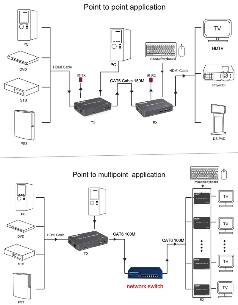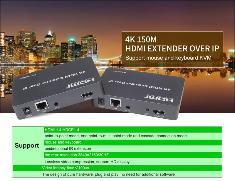 Es conveniente transmitir fuentes de audio y video HDMI. Admite modo punto a punto, un punto a muchos y modo de conexión en cascada mediante el uso junto con un conmutador de red.Se puede utilizar en salas de conferencias, plazas,