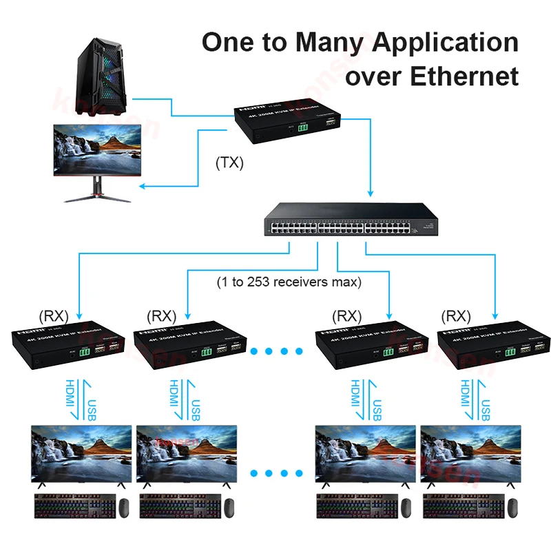 El extensor HDMI 200M sobre IP se basa en el estándar TCP/IP. Transmite su pantalla HD con la alta resolución hasta 200 metros de distancia de su DVD o fuente de ordenador mediante el uso de un cable CAT5e/6. Al mismo tiempo, es conveniente transmitir la fuente de audio y video HDMI por modo punto a punto, multipunto a multipunto y modo de conexión en cascada.Observaciones: