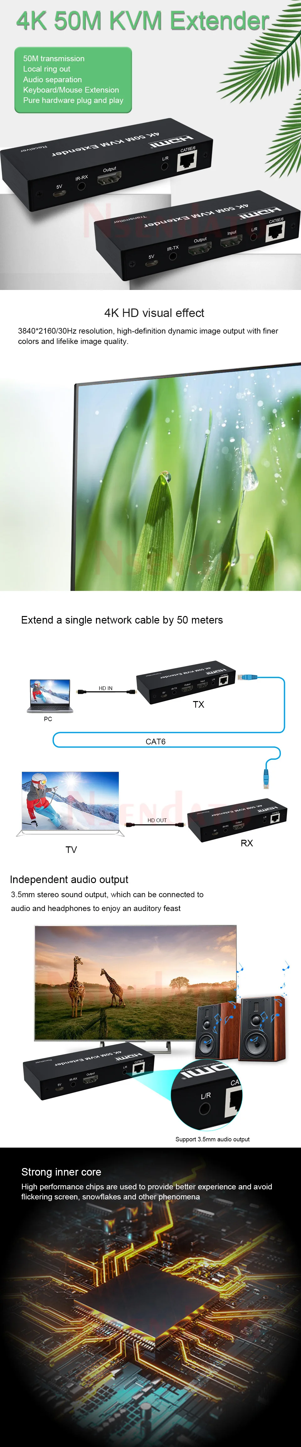 El extensor Nsendato utiliza un solo cable cat6e o Cat6 (recomendado) en lugar del cable HDMI para transmitir señal de alta definición hasta 50 metros, reduciendo el costo. El extensor está diseñado para suministrar la transmisión a larga distancia de señal de alta definición.Características:Soporte 4K/30HzSoporte loop-out localAdmite Transmisión de larga distancia de 50mBajo consumo de energía, baja temperatura y alta seguridadTanto el TX como el RX admiten salida de audio izquierda y derecha de 3,5 MMSoporte control IRSoporte extensión de ratón y tecladoEspecificación:Longitud del cable CAT-6/entre Rx y TX: hasta 50 metros.Entrada HDMI: 4K/1080P/1080i/720PSalida HDMI: 4K/1080P/1080i/720PAncho de banda máximo: 340MHzVelocidad máxima en baudios: 3x 3.4GbpsSeñal de vídeo de entrada: 0,5 ~ 1,5 voltios p-pSeñal de salida DDC: 5 voltios p-p (TTL)Distancia del cable HDMI de entrada: ≤ 10m AWG26 Cable estándar HDMIDistancia del cable HDMI de salida: ≤ 10m AWG26 Cable estándar HDMICorriente de trabajo máxima TX: 550mACorriente máxima de trabajo RX: 450mAFormato del adaptador de corriente: Entrada: CA (50HZ,60HZ) 100V-240V; Salida: DC5V/1APaquete:Extensor TXExtensor RXCable IRAdaptador de corrienteManual de usuarioSIN caja de paquete al por menor, si es necesario, por favor contáctenos primero