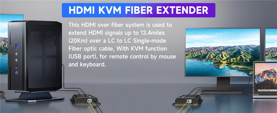 Extensor KVM USB de fibra óptica HDMI de 20Km, receptor transmisor de vídeo 1080P de 120 Hz a través del extensor de cable de fibra LC, interruptor KVM para teclado de ratón y PC