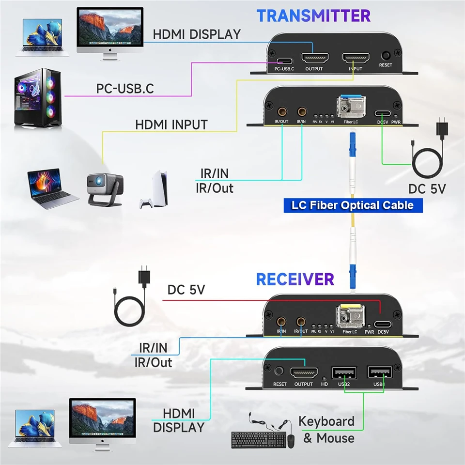 20Km 4K @ 60Hz HDMI Fibra Óptica USB KVM Extensor Transmisor de Video Receptor HDMI Loop sobre Cable de Fibra LC para PS4 PS5 DVD PC a Monitor de TV