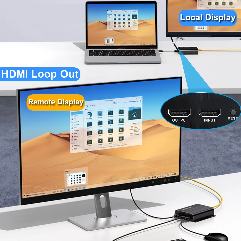 Extensor de fibra óptica HDMI Navceker con 2 puertos USB 2.0, podría admitir teclado y mouse inalámbricos o con cable para controlar remotamente la fuente de entrada HDMI. Nota: el puerto USB no admite cámara USB, controlador flash USB, impresora, etc.