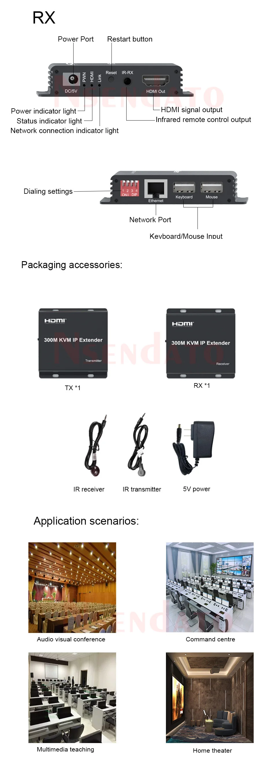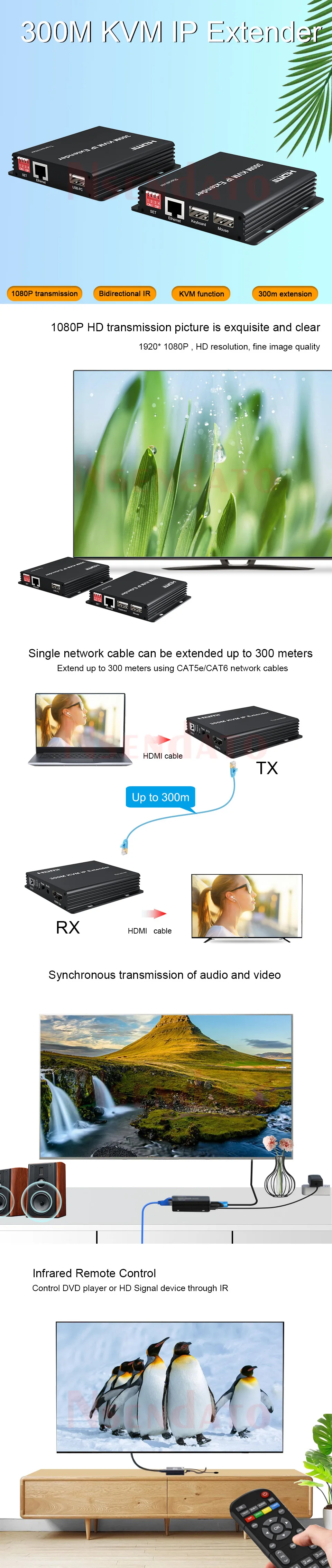 Nota:1. Conjunto completo que incluye transmisor + receptor; solo el receptor es solo el receptor2. El enlace tiene dos versiones, pero la descripción para el extensor HDMI con la versión KVM, contáctenos si tiene algún problemaIntroducción:El extensor HDMI IP de 300M se basa en el estándar TCP/IP. Transmite su pantalla HD con la alta resolución hasta 300 metros de distancia de su DVD o fuente de ordenador mediante el uso de un cable CAT5e/6. Al mismo tiempo, es conveniente transmitir la fuente de audio y video HDMI por modo punto a punto, punto a multipunto, modo multipunto a multipunto y modo de conexión en cascadaCaracterísticasSoporte HDCP1.4Modo de decodificación MJPEGAdmite modo punto a punto, modo punto a multipunto, modo multipunto a multipunto y modo de conexión en cascada;Estándar Ethernet 802,3;El diseño de hardware puro, plug and play, sin necesidad de software adicionalResoluciones: 480P/720P/1080PAudio: Frecuencia de muestreo: 32kHz, 44,1 kHz y 48kHzFormato del adaptador de corriente: Entrada CA (50HZ, 60HZ) 100V-240V; Salida: DC5V/1APaquete:TransmisorReceptorAdaptador de corriente 5VManual