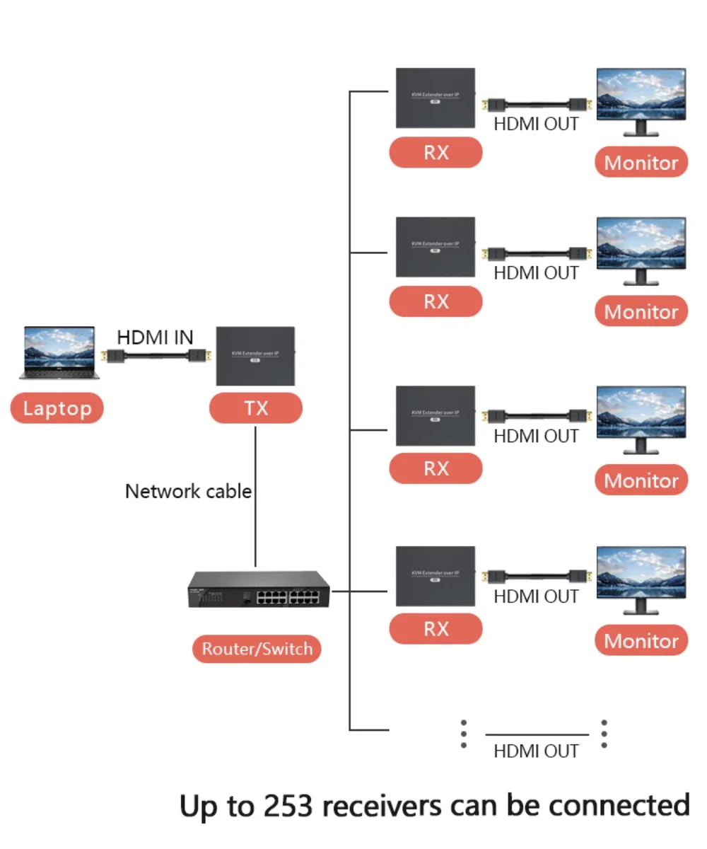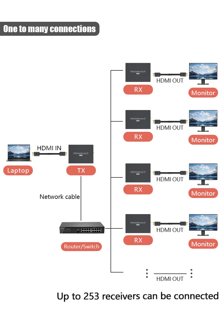 El extensor HDMI proporciona extensión de señales HDMI de largas distancias a través de un único cable CAT5e/6/7, admite alta resolución de hasta 1080P@60Hz, señal de teclado y mouse y transmisión de salida de bucle HDMI.El extensor se puede utilizar para una amplia gama de aplicaciones que requieren transmisión de larga distancia de alta resolución con alta calidad gracias a su buena estabilidad y su potente seguridad.