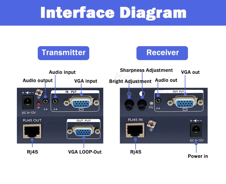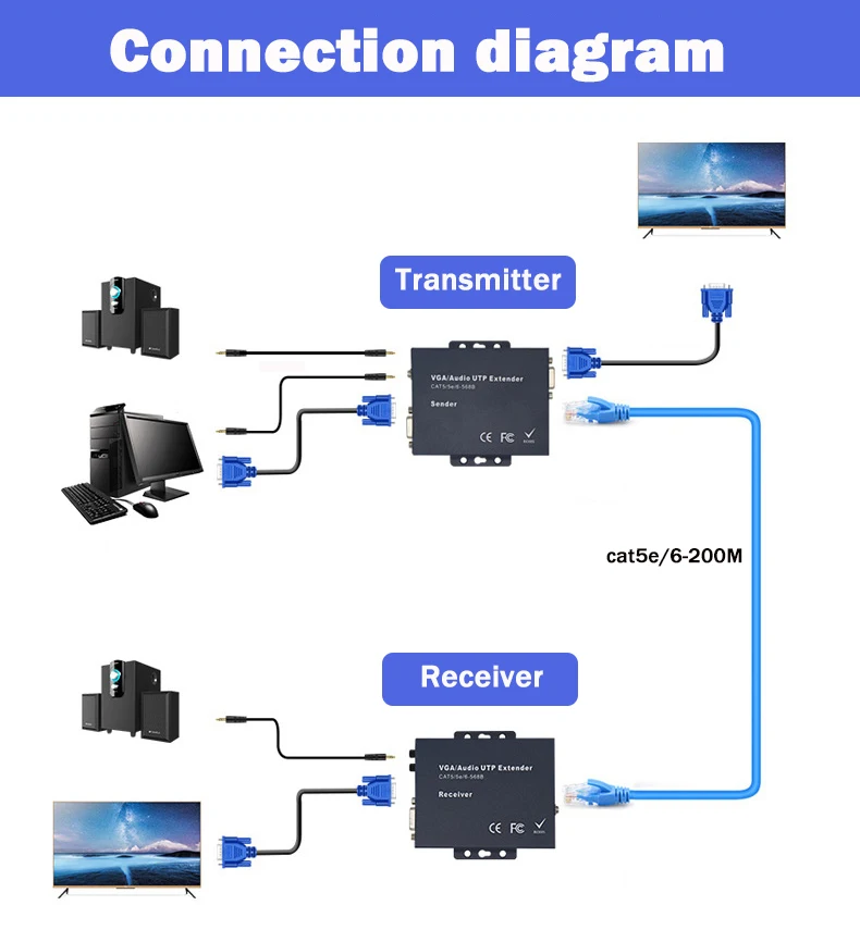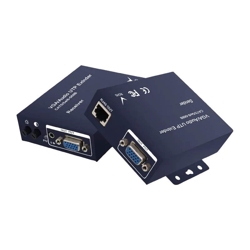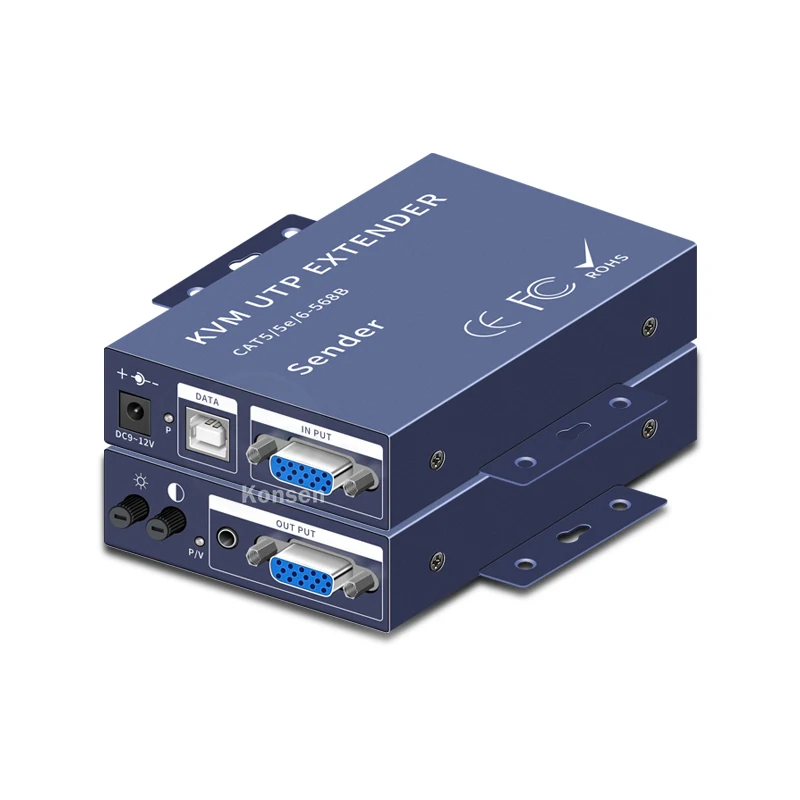 El extensor VGA KVM proporciona una extensión de la señal de audio de vídeo VGA a largas distancias sobre un solo cable Ethernet RJ45 CAT5/5e/6, admite alta resolución de hasta 1920*1440 @ 60Hz y señal de teclado/ratón (señal HID) y transmisión de señal de audio estéreo externa. El extensor puede usarse para una amplia gama de aplicaciones que requieren transmisión a larga distancia de alta resolución con alta calidad por su buena estabilidad y seguridad potente.