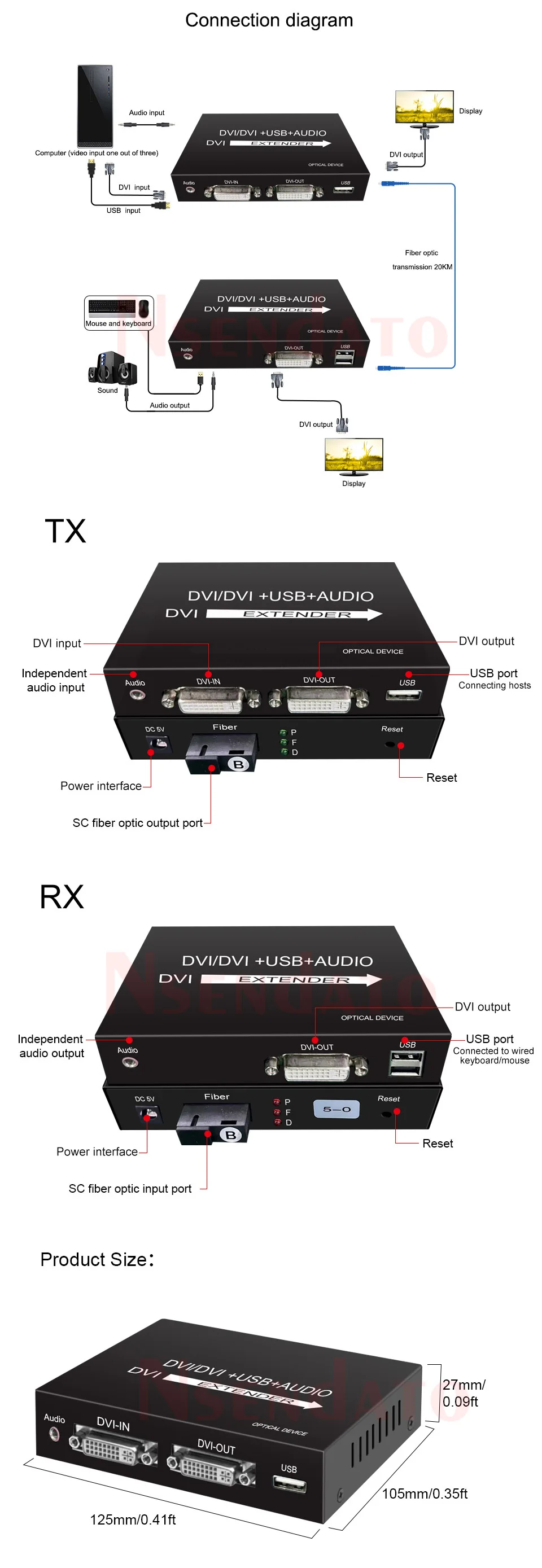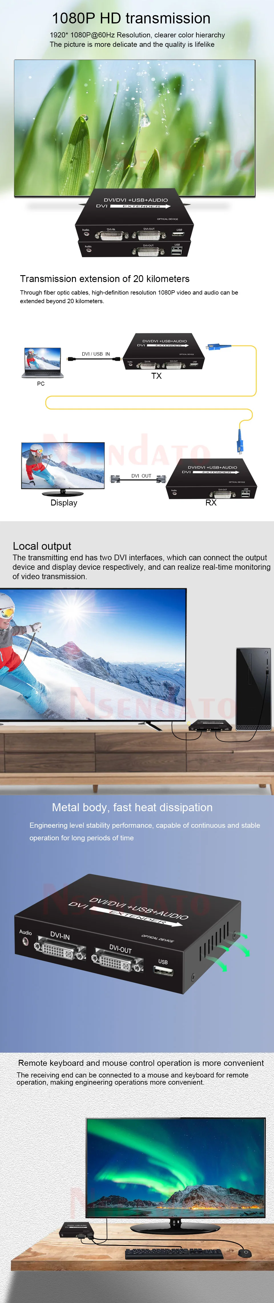 Extensor KVM USB óptico DVI de 20km sobre fibra óptica por SC DVI a USB KVM extensor de Monitor óptico compatible con teclado, ratón, TV y PC
