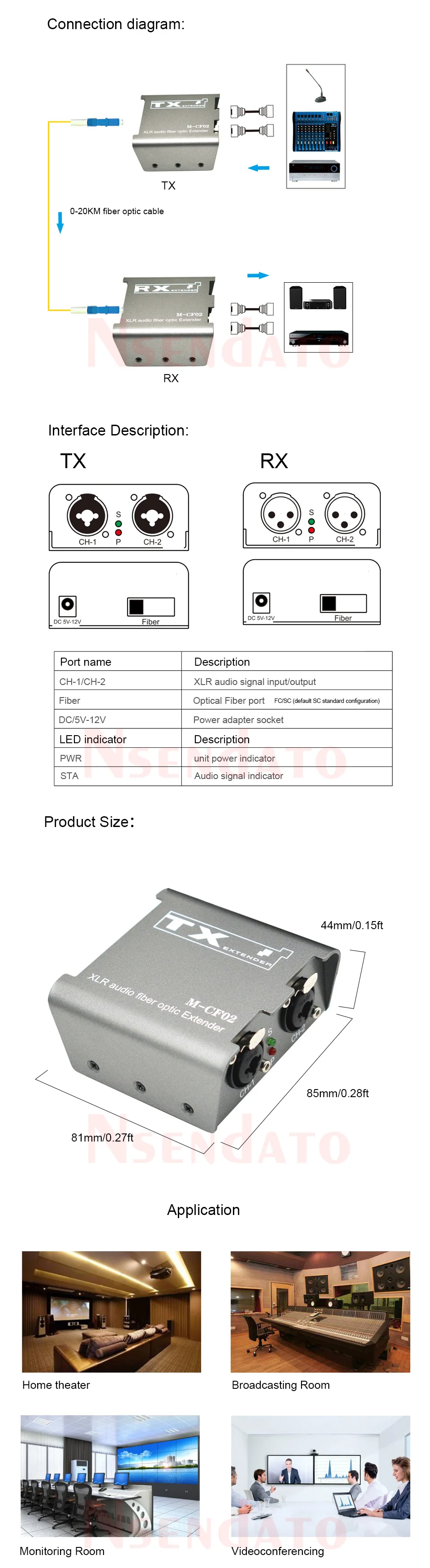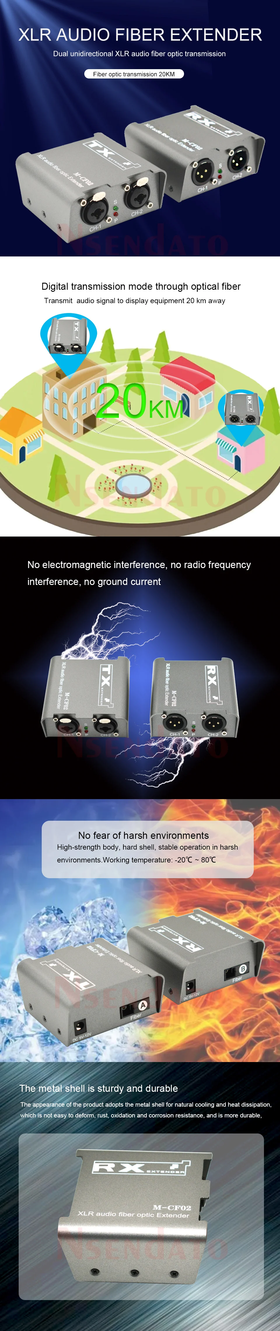 Nota: el enlace tiene dos modelos, uno es de una vía, el otro es de dos vías, por favor seleccione el que desee.IntroducciónEl transmisor óptico de audio digital bidireccional Nsendato puede usar una fibra óptica para transmitir señales de audio bidireccional. La señal de audio adopta un muestreo digital de 24 bits/96KHz para garantizar una transmisión de alta fidelidad; Todos los canales de transmisión óptica digital garantizan una transmisión de señal de alta calidad 。Este producto se puede aplicar a equipos de audio de alta fidelidad de consola de juegos, TV box, cine en casa de alta fidelidad, videoconferencia de proyección de pantalla grande, sistema de transmisión de video público, educación multimedia remota, enseñanza y sistema médico, campo Militar, demostración de publicidad de medios de vídeo de panel plano, etc.CaracterísticasTransmisión de fibra óptica de audio XLR unidireccional bidireccional, la distancia predeterminada es de 20km (0-120km opcional);Transmisión digital de alta velocidad;Transmisión digital de alta velocidad;Sin interferencias electromagnéticas, interferencias de radiofrecuencia y corriente de tierra;Garantiza una transmisión segura en entornos electromagnéticos hostilesEspecificaciónImpedancia de entrada de audio: 10KImpedancia de salida de audio: 600ΩModo de interfaz: Interfaz desequilibradaRelación de rango de salida de entrada: 1/1Respuesta de frecuencia: 20HZ-20KHZFrecuencia de muestreo de audio: 24 bits/96KHZRelación señal-ruido (SNR):≥ 75dBInterfaz de audio:(XLR)Longitud de onda de transmisión óptica: TX:1310nm, RX:1550nmInterfaz óptica: FC/SC (SC por defecto)Potencia óptica transmitida: máx. 10dB/20KMSensibilidad de recepción:-35 @ 155 MB/SRango dinámico óptico:-39dB ~-42dBPérdida de cadena máxima permitida óptica: 25dBDistancia de transmisión: 20km (modo único)Potencia: DC 5V-12V/1ADisipación de potencia: 4,8 W @ DC5VPaqueteTransmisor XLRReceptor XLRAdaptador de corrienteManual de usuarioComprar Extensor óptico de fibra de Audio, transmisor de Audio equilibrado XLR de 1/2 canales, sobre fibra óptica SC, hasta 20km, 2 vías