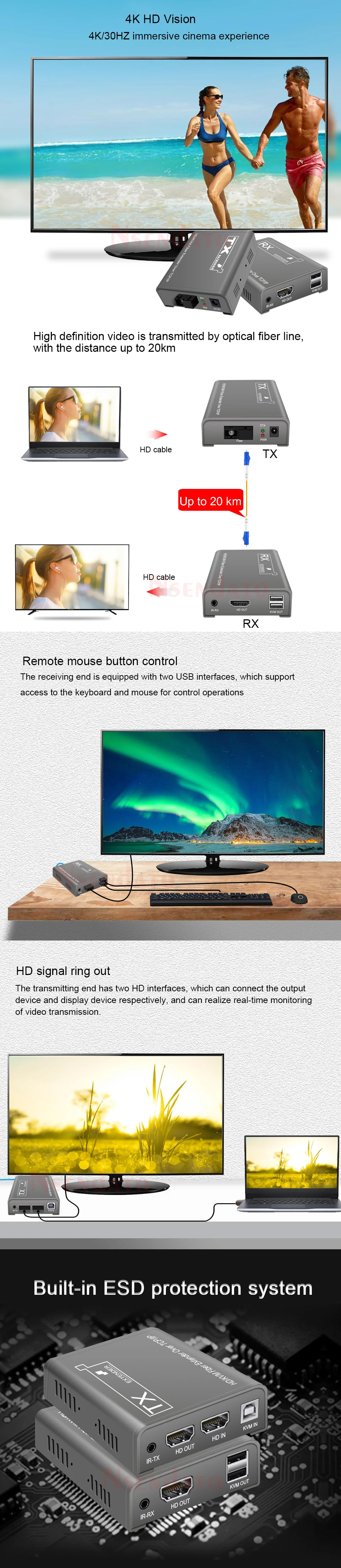 HDMI USB KVM Optical Extender 4K 20KM TCP/IP KVM Extender HDMI over SC FC Fiber USB 2.0 sharing keyboard mouse Switch With IR