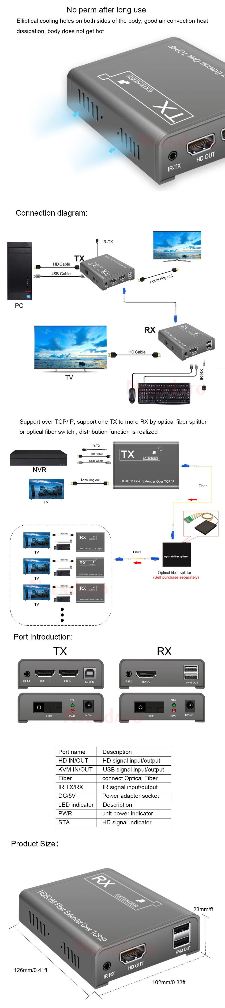 The extender provides extension of HD signals long distances over a single Fiber, it supports high resolution up to 1080P, KVM and IR signal transmission. The extender can use for a wide range of applications requiring long distance transmission of high resolution with high quality by its good stability and powerful security.