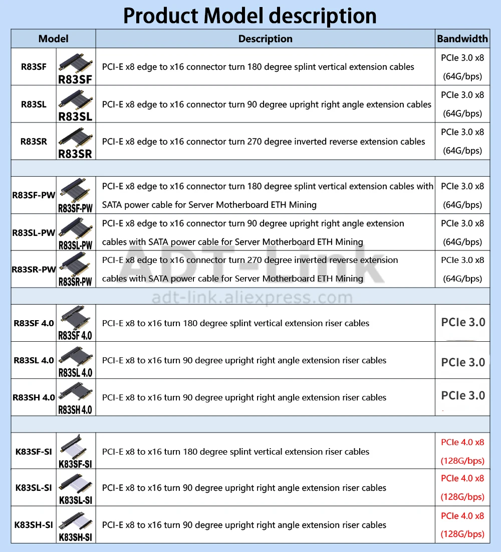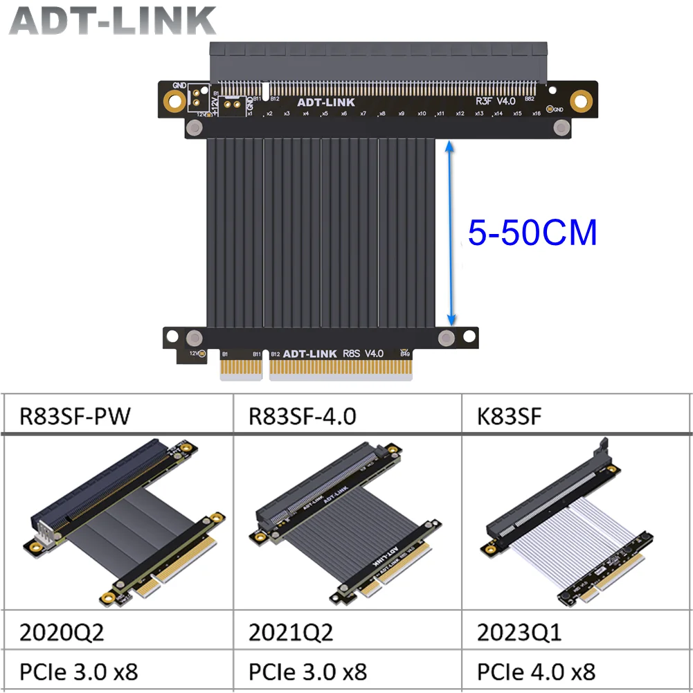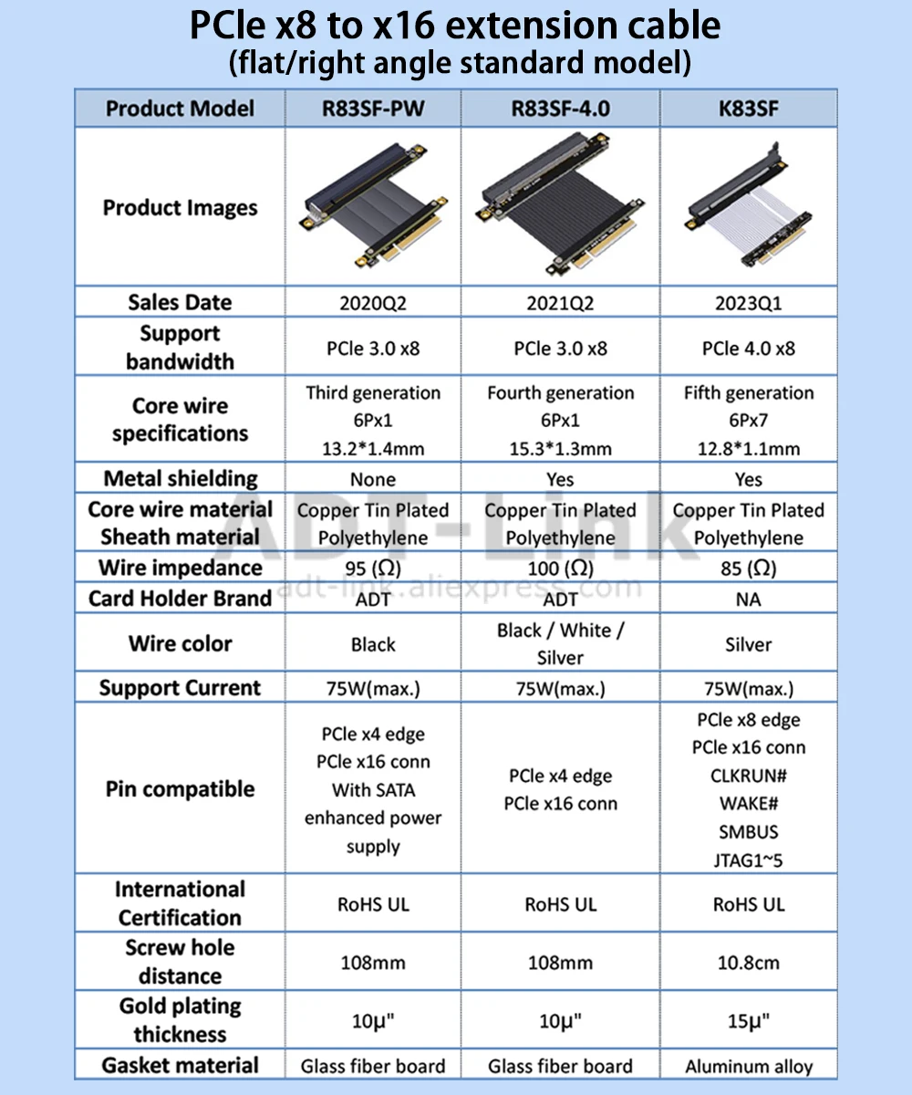 El cable es la cuarta generación de cable PCIe dedicado desarrollado y diseñado por ADT. El grosor del cable negro es de 1,3mm, el cable plateado es de 1,4mm y el cable azul es de 0,85mm. El cable se puede doblar y plegar sin afectar el uso.