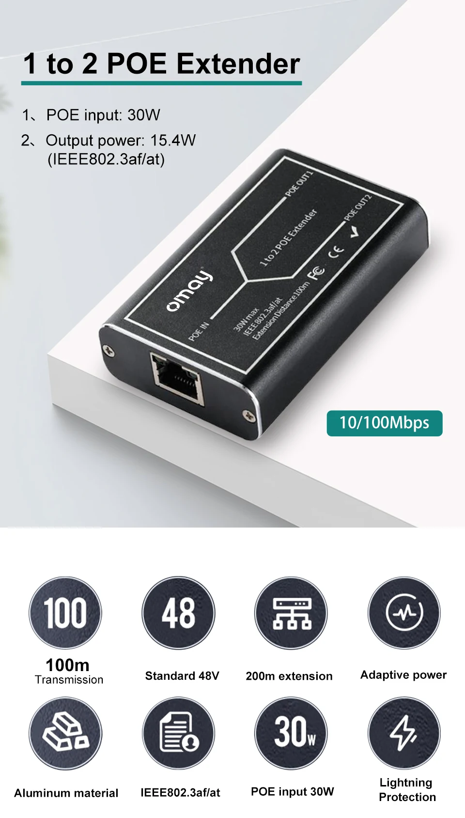 Comprar Extensor POE de 1 a 2 puertos, 10/100/1000Mbps, IEEE 802.3af/at estándar, 48V, para cámara IP NVR, POE, 100 metros de alcance