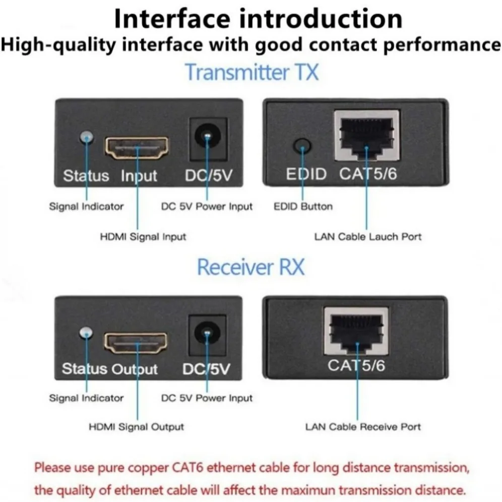 4. Transmisión de señal: Cat6 CAT5e o utilice un cable (recomendado) en lugar de un cable HDMI para conectar los puertos RJ45 del receptor y el transmisor, que pueden transmitir hasta 60 metros;