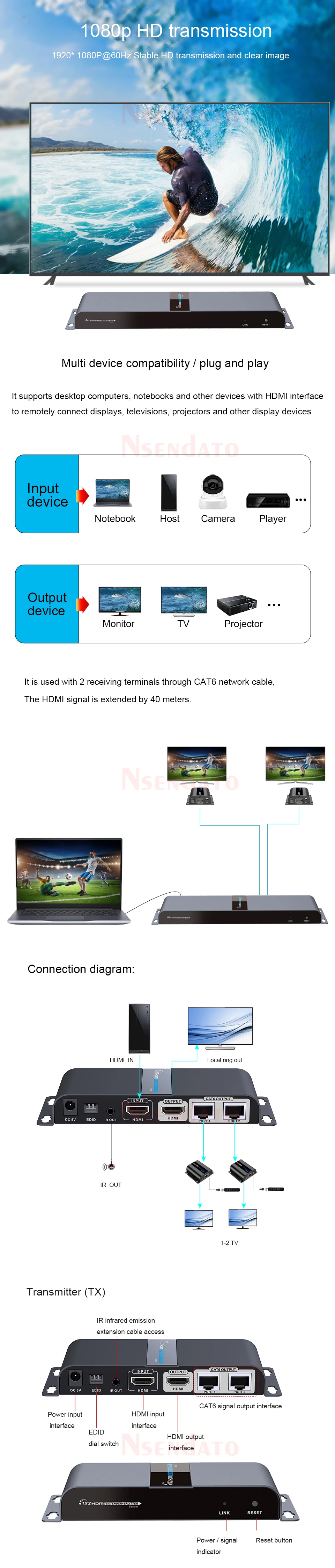 Comprar Extensor de red LKV712pro HDMI POE 1X2, divisor HDMI 1080P, transmisor de vídeo, receptor, Cable de extensión sobre Cat6/7 RJ45 40M EDID