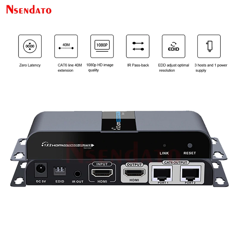 IntroducciónEste divisor extensor HDMI incluye un transmisor y dos receptores, extiende 1 fuente compatible con HDMI a 2 pantallas HDMI sobre un solo cable CAT6/6a/7 de hasta 40m/131ft. La resolución más alta admitida es 1920x1080 @ 60Hz, y admite paso IR, paso EDID y solo se necesita un adaptador de corriente para el transmisor,. El receptor está alimentado por el transmisor a través del cable CAT6. Solución Ideal para exposición compatible con HDMI, videoconferencia y centro de espectáculos, etc.Características:1. Distribuye 1 fuente HDMI a 2 pantallas HD a través del cable de red simultáneamente.2. Admite un bucle de salida HDMI.3.Compatible con cables de red CAT6/6a/7.4. La distancia de transmisión es de 40m/pies.5. La resolución más alta es de hasta 1920x1080 a 60Hz.6. Soporta 20 ~ 60Hz IR pass back.7. Compatible con EDID.8. Admite energía desde el transmisor hasta la unidad receptora a través del cable CAT6.9.Plug and play.10. Función de montaje en pared, fácil instalación.El paquete incluye:1 unidad de transmisor xHDMIMIUnidad receptora 2xhdmi2xIR cable receptor1xIR cable Blaster1xAC 110 ~ 240V proveedor de energía1x manual de usuario