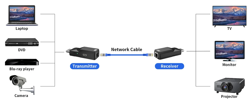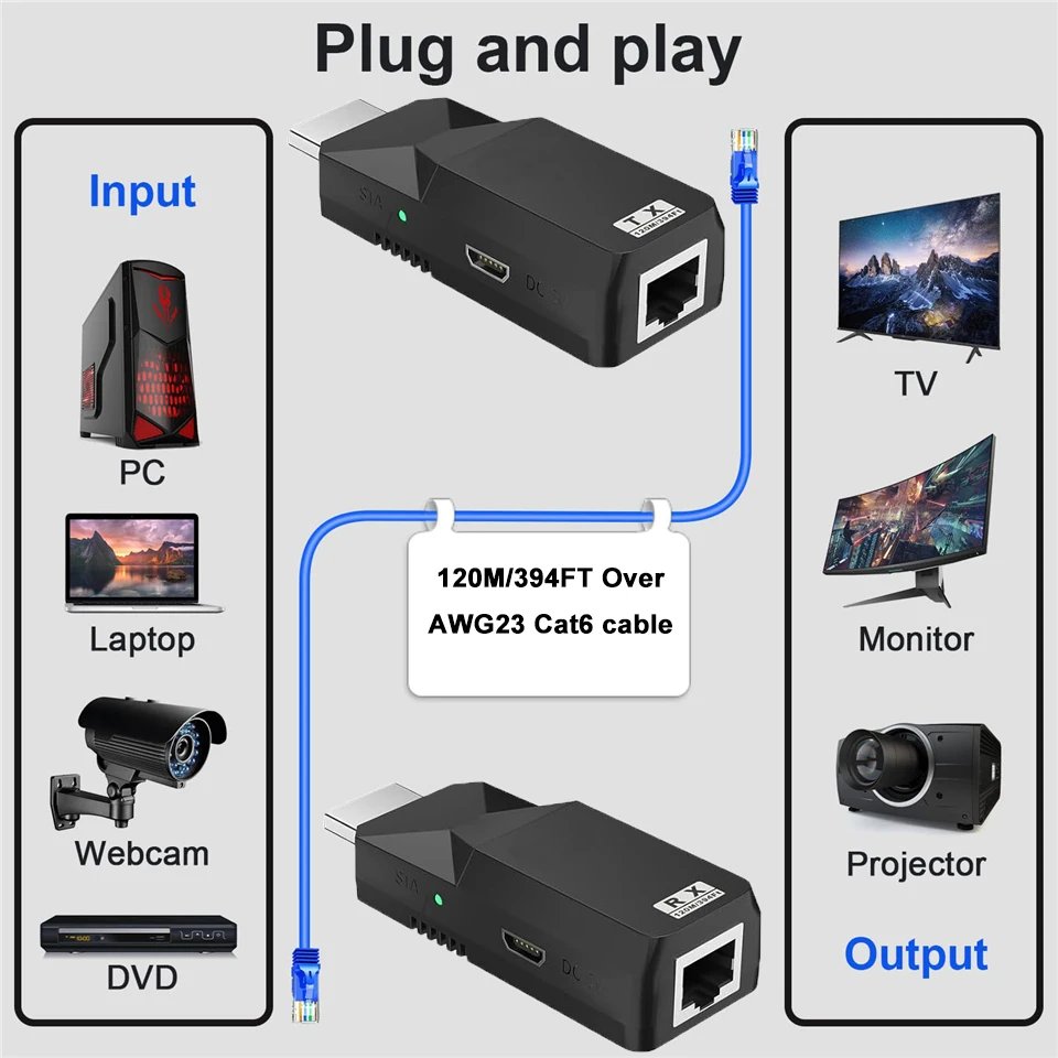 Nuestro extensor HDMI puede transmitir señal de audio y video sin pérdidas y sin comprimir a través de un solo cable RJ45 Cat6/Cat5e de hasta 394 pies (120 metros) larga Distancia (la distancia de transmisión se acortará a 100m si utiliza el cable cat5e). Plug and play, no se necesita controlador. Compatible con sistemas Windows, Mac OS y Linux.