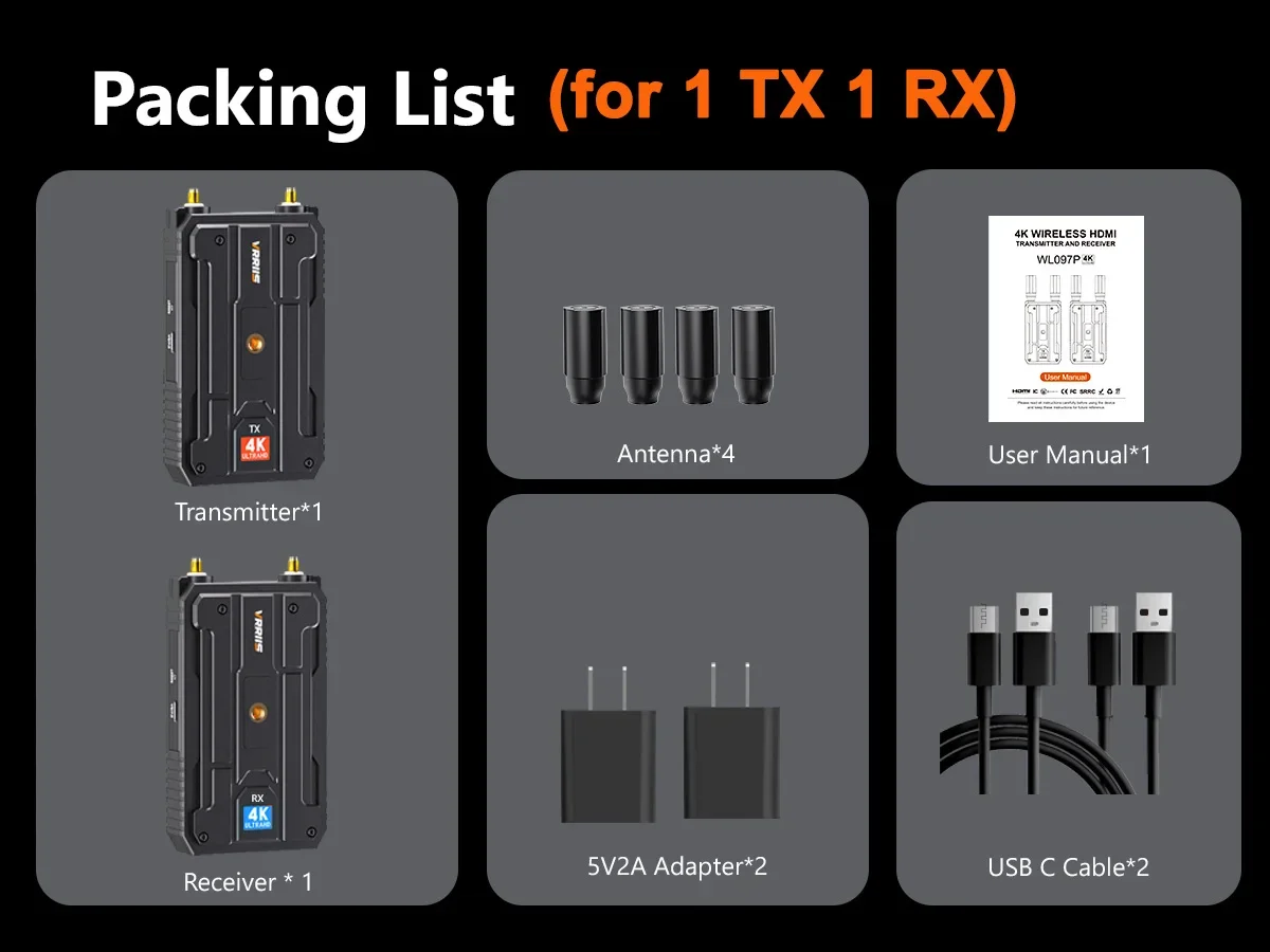 Lista de embalaje 1TX 1RX o 1TX 2/3/4 RX:
