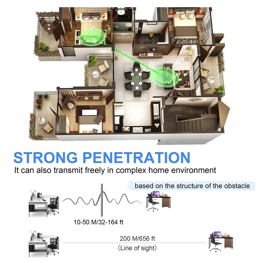 2.La distancia de transmisión variará según el entorno de uso.Paredes, el grado de obstrucción y