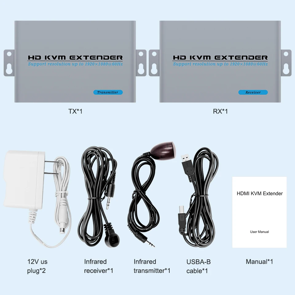 Puerto:Parte TX1: entrada Dc5-12v * 12: entrada HDMI * 13: Salida de bucle HDMI * 14: Salida RJ45 * 15: bus USB-b * 1 conectado al host6: Línea de emisión IR * 1Parte RX1: entrada Dc5-12v * 12: Salida HDMI * 13: entrada RJ45 * 14: Base USB-a hembra * 2 conectada con mouse y teclado5: Línea de recepción IR * 11 Uds TX + 1 Uds RX El paquete incluye:Transmisor extensor HDMI--------------------------------1 Uds.