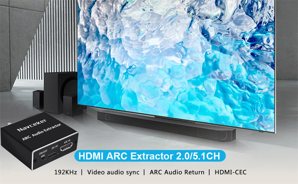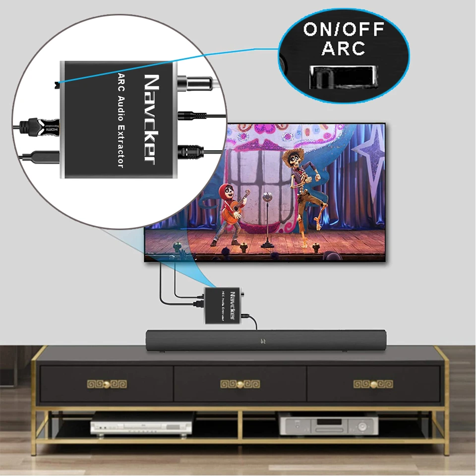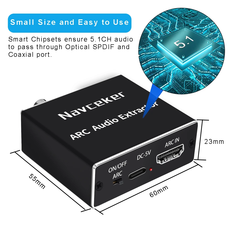Convertidor de adaptador Navceker HDMI ARC (canal de retorno de Audio), puede transmitir audio desde la TV compatible con la función ARC a óptica, coaxial, conector de audio de 3,5mm del adaptador a través de la interfaz HDMI/ARC, Y salida simultáneamente, lo que resuelve perfectamente los problemas de no tener interfaz de salida de audio que el televisor no se puede conectar al sistema de sonido.