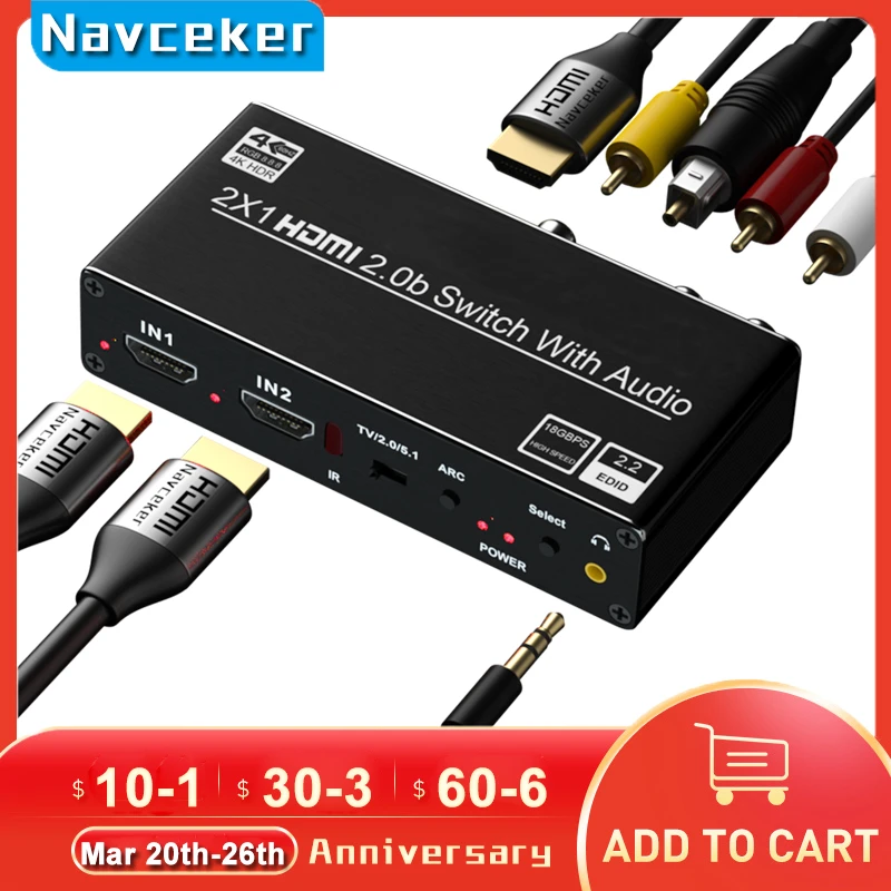El Extractor de audio Navceker HDMI 2.0b Switch es un conmutador HDMI 2,0 4K 60Hz de 2 puertos HDMI para su última configuración de juegos y cine en casa. Soporta 2 entradas HDMI y 1 salida HDMI, lo que permite HDMI 2,0 y HDCP 2,2, junto con 4K @ 60/120Hz Ultra HD y compatibilidad en todos los HDMI.