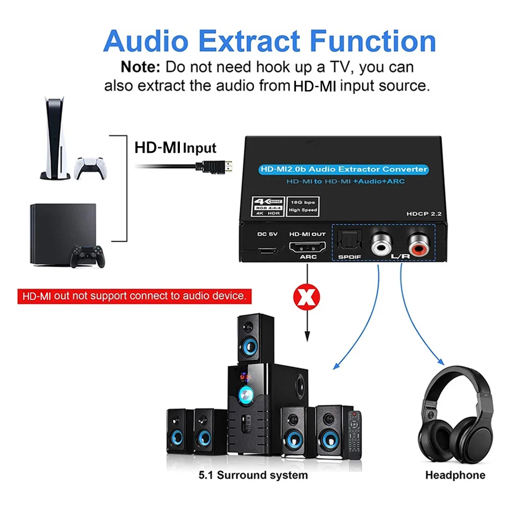 4-[Amplia compatibilidad] El convertidor de audio HDMI funciona perfectamente con varios dispositivos fuente HDMI, como Amazon Fire TV, Apple TV, PS3/4/5, Chromecast, reproductores de Blu-ray/DVD/HD, decodificadores de cable/satélite, Xbox, PC/portátil, cámaras HD, DVR HD, etc.Simplemente conecte sus dispositivos para mejorar su experiencia de cine en casa con video y audio de alta resolución.
