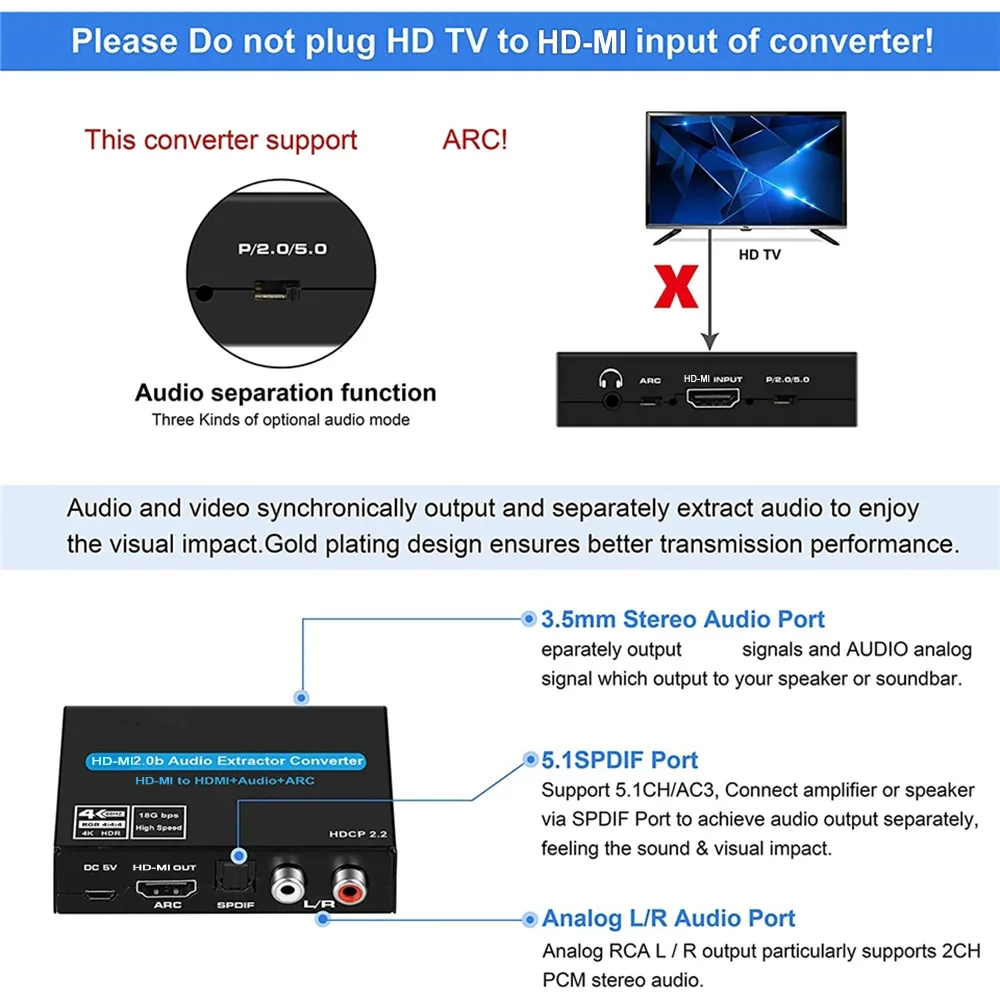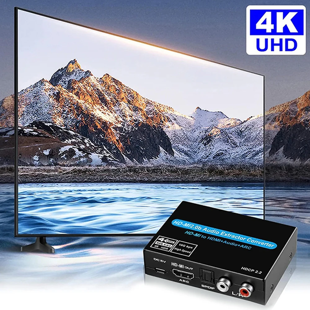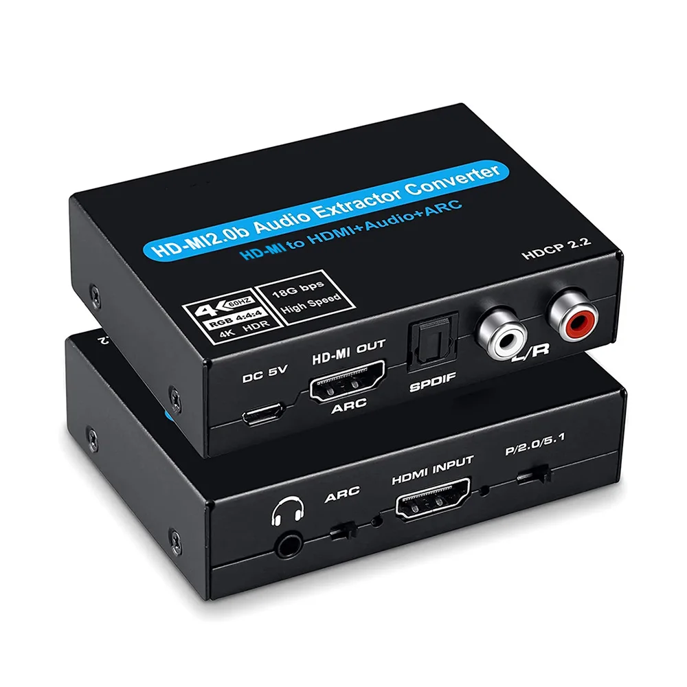 El convertidor extractor de audio y ARC HDMI2.0b admite 4K/2k@60hz para Apple TV Dolby Atmosphere HDR10 Dolby Vision, Blu-ray/DVD/reproductor HD/TV por cable/Fire TV/PS3/4/X PC/portátil, cámara HD y más.