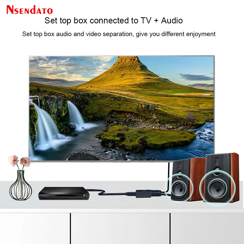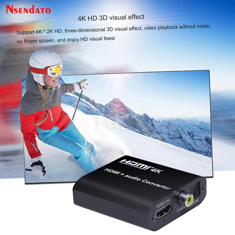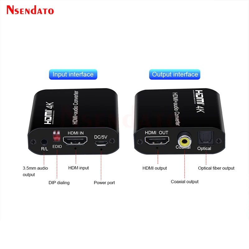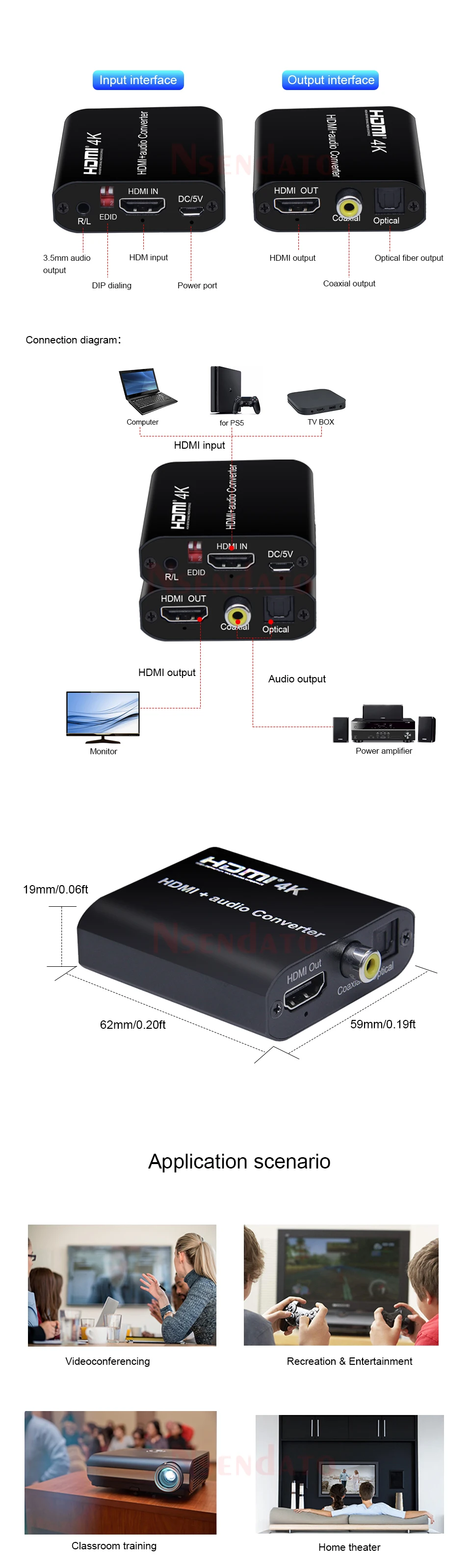 Proyector, y convierte la señal de audio digital pelada a través de la salida de audio óptica/coaxial en amplificador o altavoz, la señal de audio analógica pelada a través de la salida a los auriculares, para que el audio y el vídeo se puedan separar. La resolución de este convertidor puede ser de hasta 4096X2160/30Hz