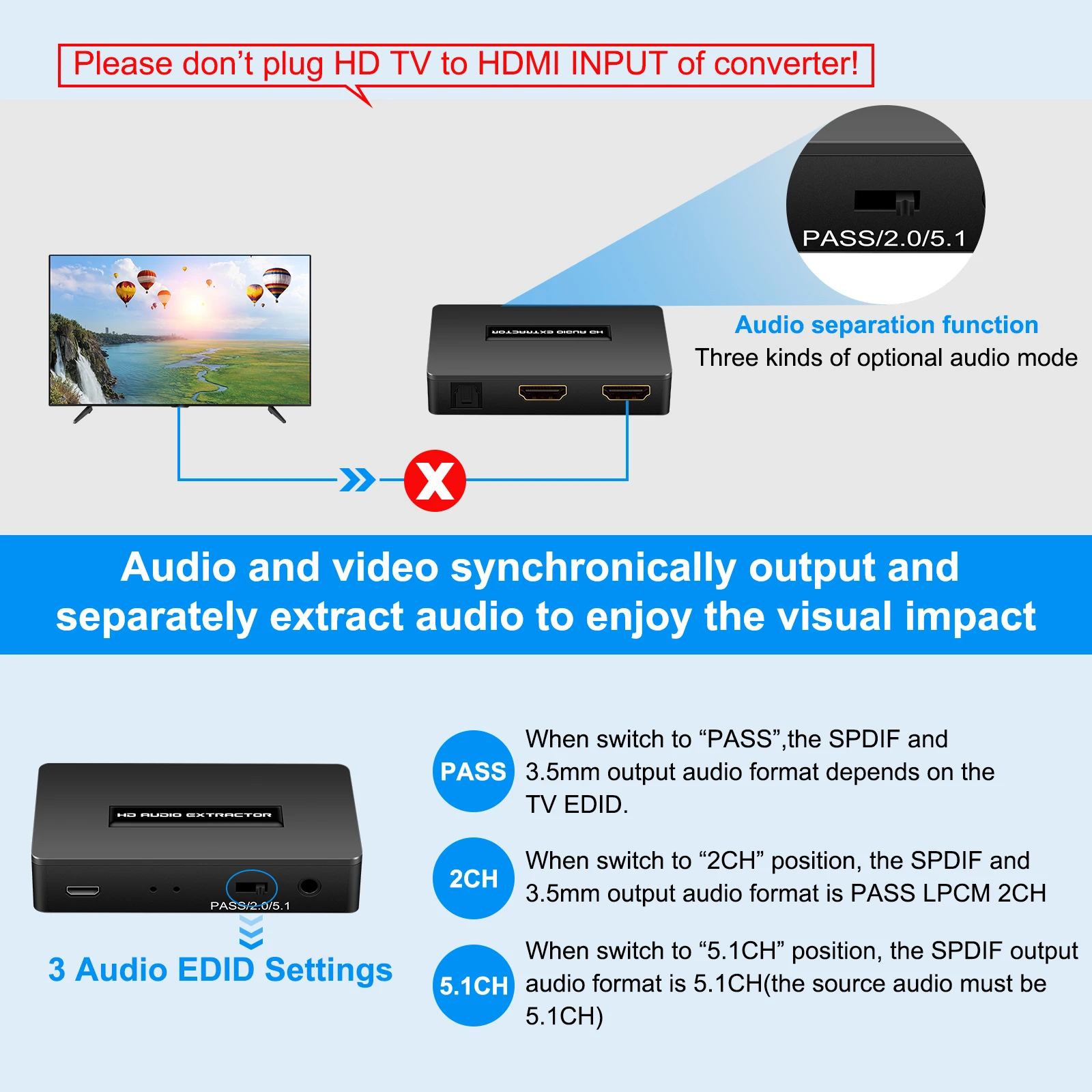 【TRES AJUSTES EDID DE AUDIO 】: El convertidor de audio HDMI tiene tres tipos de modo de audio TV, 2.0CH y 5.1CH. Salida de audio de 3,5 MM compatible con audio estéreo 2.0CH PCM LPCM; La Salida Óptica SPDIF admite 2.0CH PCM entrante, 5.1CH. (Nota: Nuestro extractor de audio no puede decodificar estos formatos de audio. Si su amplificador o barra de sonido no admite estos formatos de audio, no habrá audio en su barra de sonido o amplificador, así que configure el formato de audio en la fuente HDMI en formato de audio PCM/ LPCM).