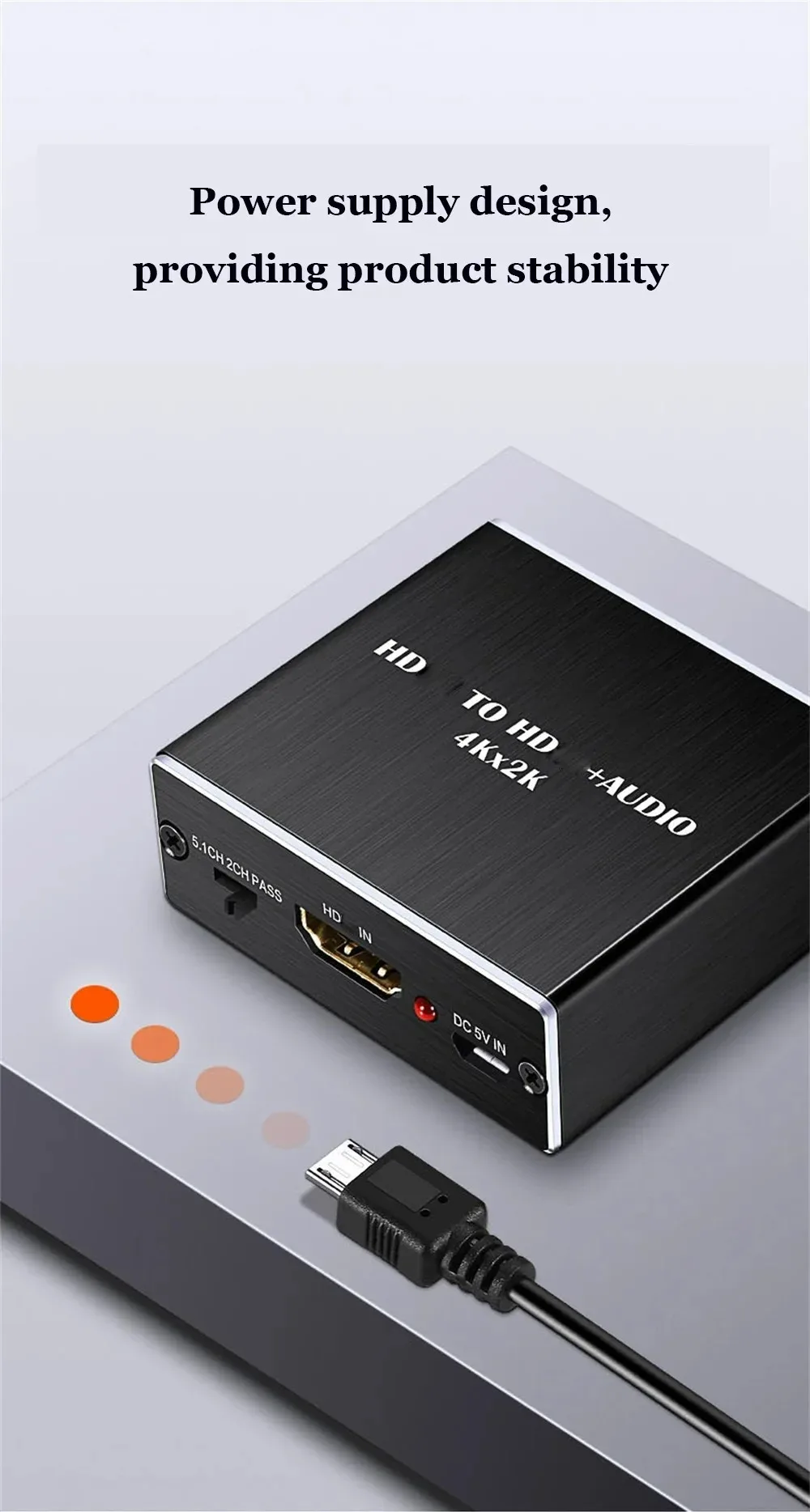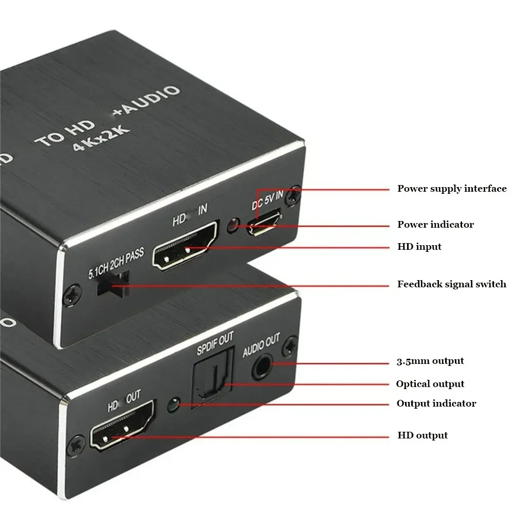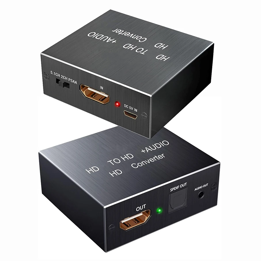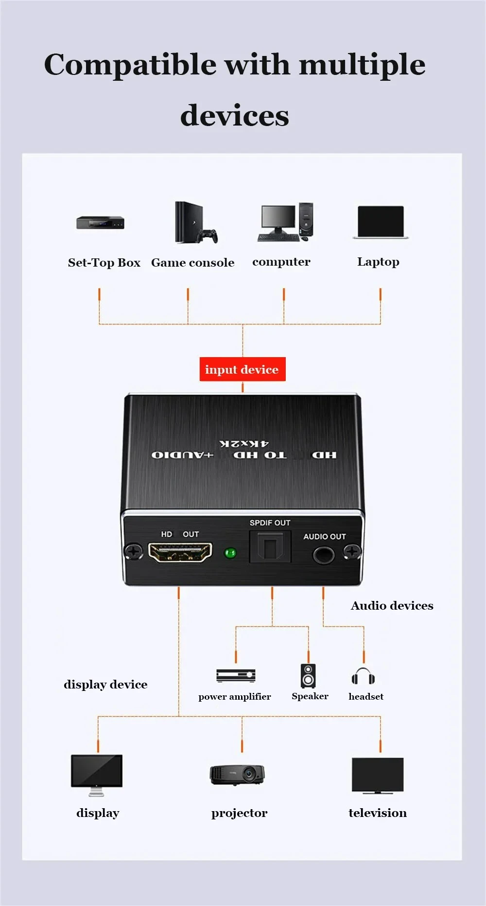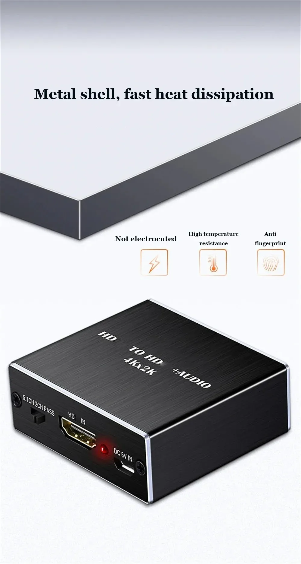Este es un extractor de audio HD multifuncional y de alto rendimiento, este extractor puede extraer la señal de audio entre la señal compatible con HDMI al sistema amplificador de potencia para obtener efectos de audio de alta calidad que son difíciles de lograr para el altavoz de TV.