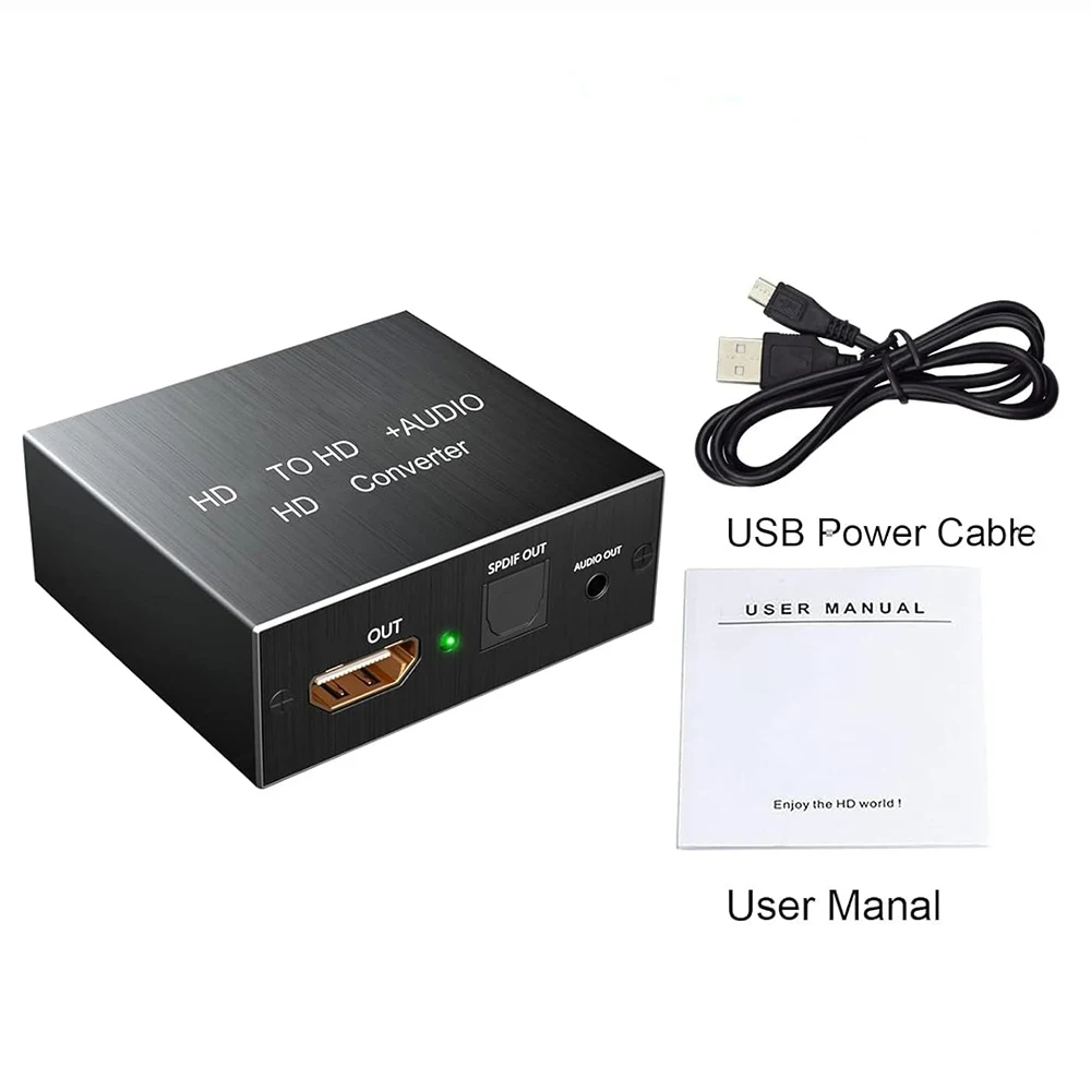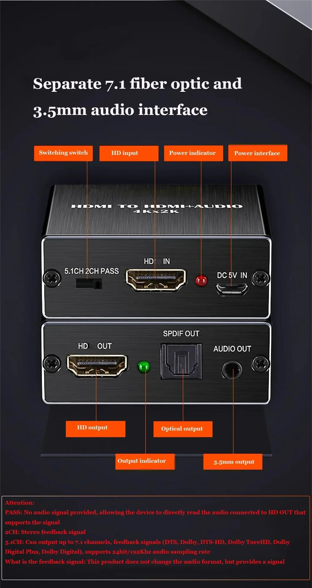 HD 4K compatible con HDMI 1,4 V-el extractor de audio compatible con HDMI admite HDCP1.4, calidad de imagen ultra HD RGB [email protected] salida de audio óptica admite Dolby/DTS 5.1.La salida estéreo de 3,5 mm admite PCM/LPCM.Nota: El convertidor de audio no admite 7.1 canales.