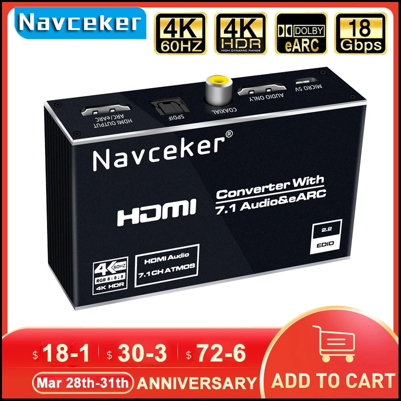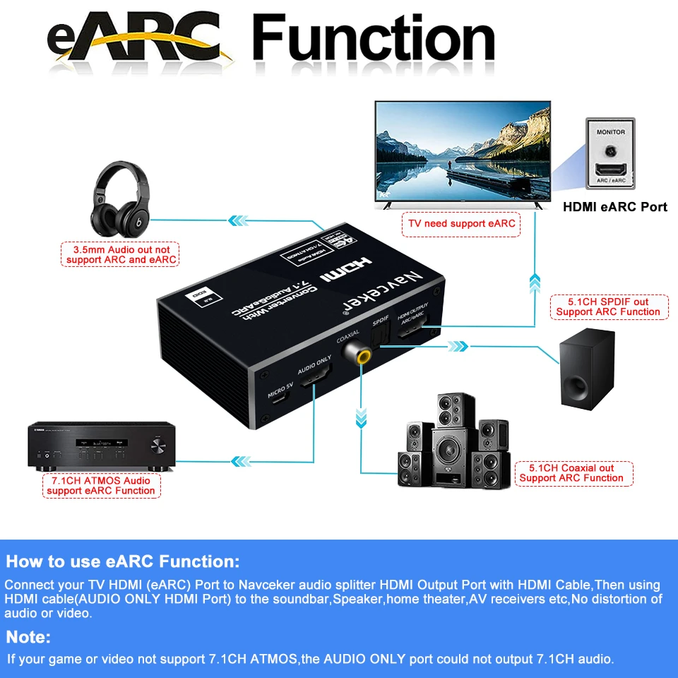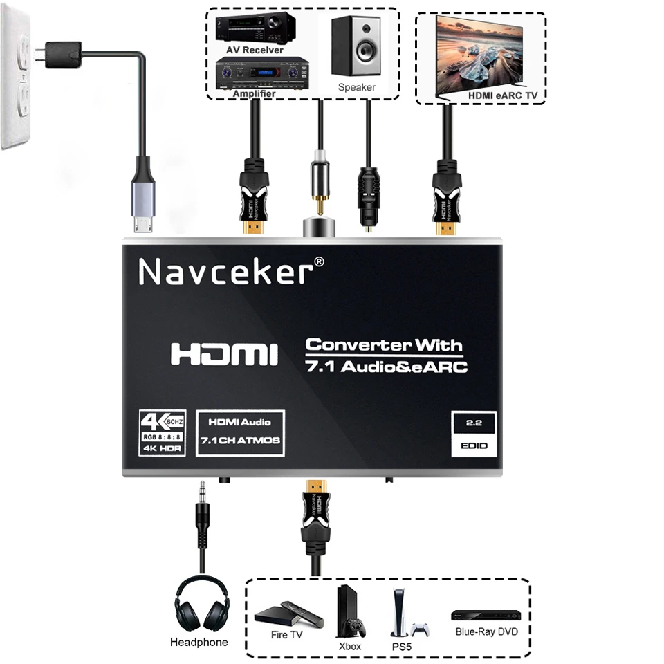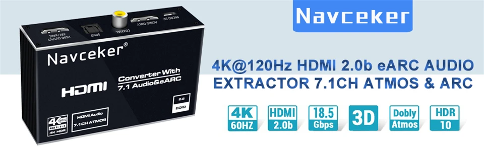 Navceker 4K 120Hz HDMI 2,0 eARC Audio Extractor es un interruptor de alto rendimiento de 1 entrada HDMI y 1 salida HDMI con salida de audio. Salida de audio HDMI /Toslink/3,5mm Jack compatible con la función de extracción de audio, AUDIO SOLAMENTE HDMI /Toslink /Coaxial compatible con ARC (canal de retorno de Audio),AUDIO SOLACE HDMI compatible con eARC (canal de retorno de Audio mejorado). El sistema admite todos los formatos de TV 3D además de todos los formatos HDTV de hasta 4K x 2K @ 60Hz RGB 8 :8 :8.
