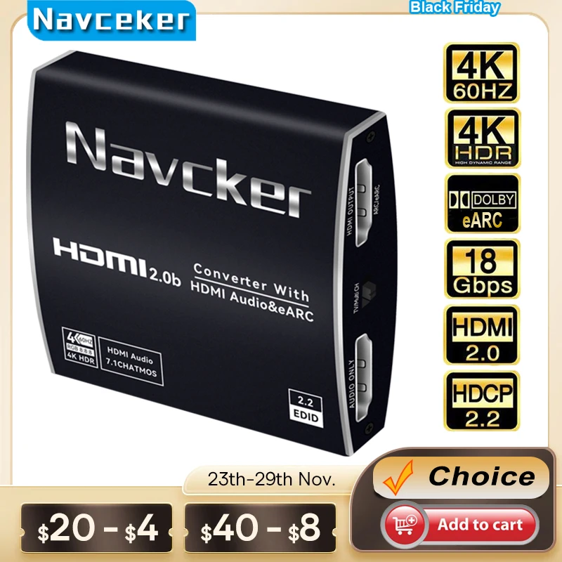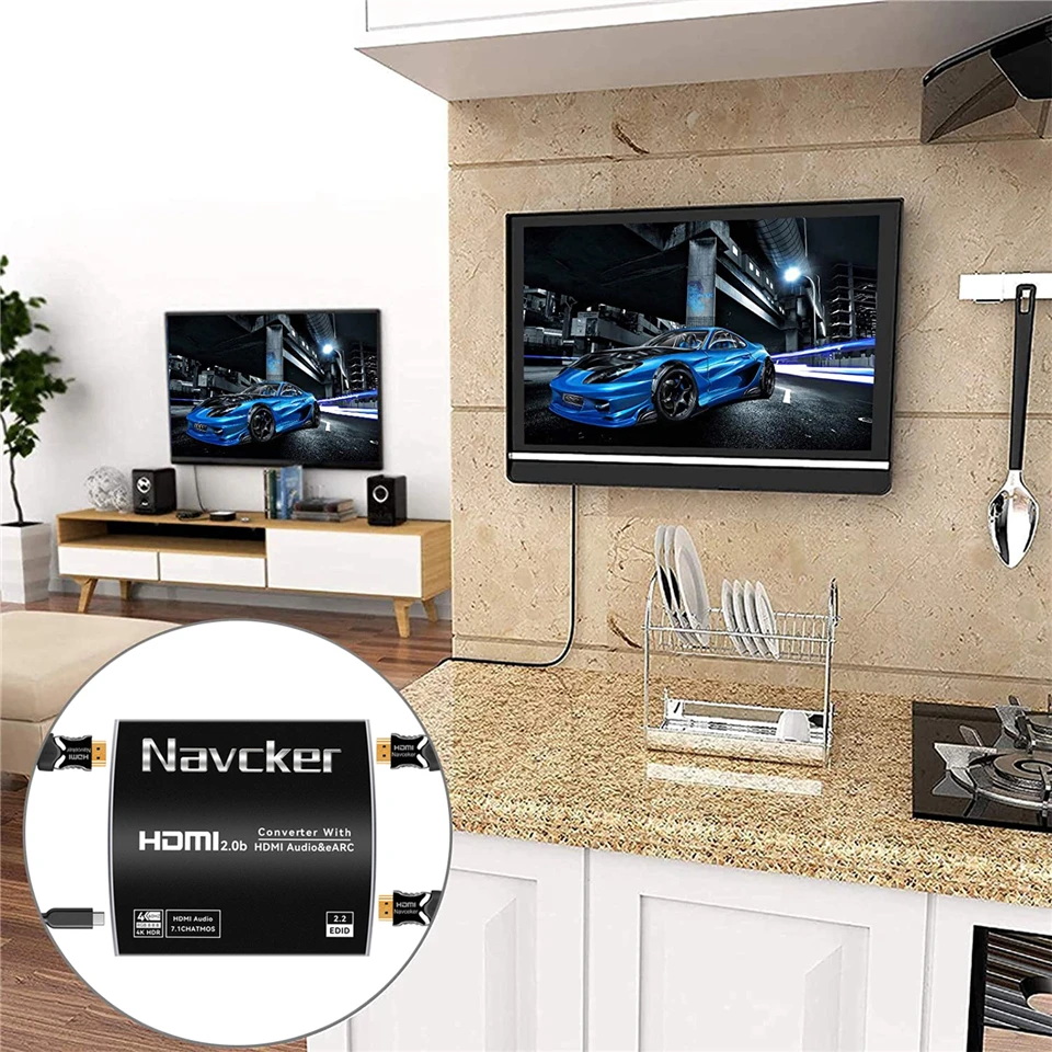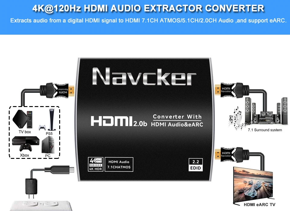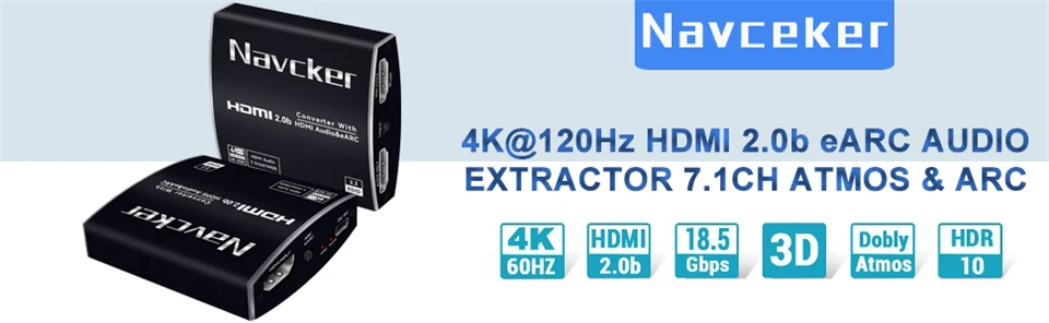 Navceker 4K 120Hz HDMI 2,0 eARC Audio Extractor es un interruptor de alto rendimiento de 1 entrada HDMI y 1 salida HDMI con salida de audio. SOLO AUDIO La salida de audio HDMI admite la función de extracción de audio, SOLO AUDIO HDMI admite eARC/ARC (canal de Retorno de Audio mejorado). El sistema admite todos los formatos de TV 3D además de todos los formatos HDTV de hasta 4K x 2K @ 60Hz RGB 8 :8 :8.