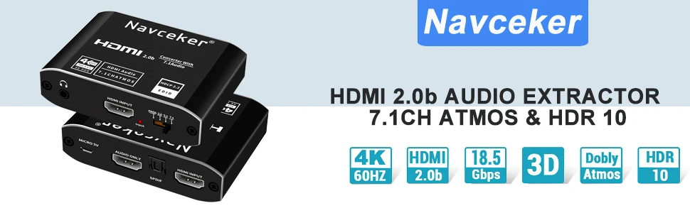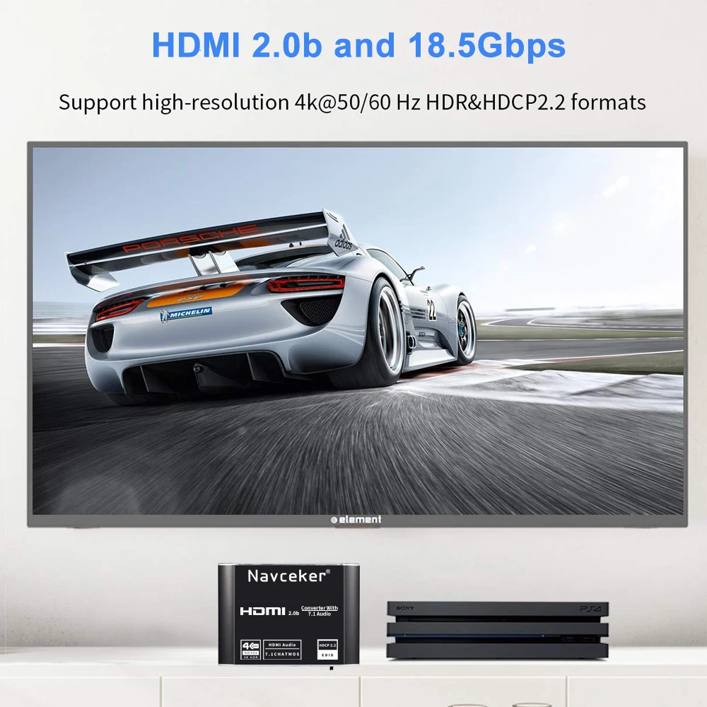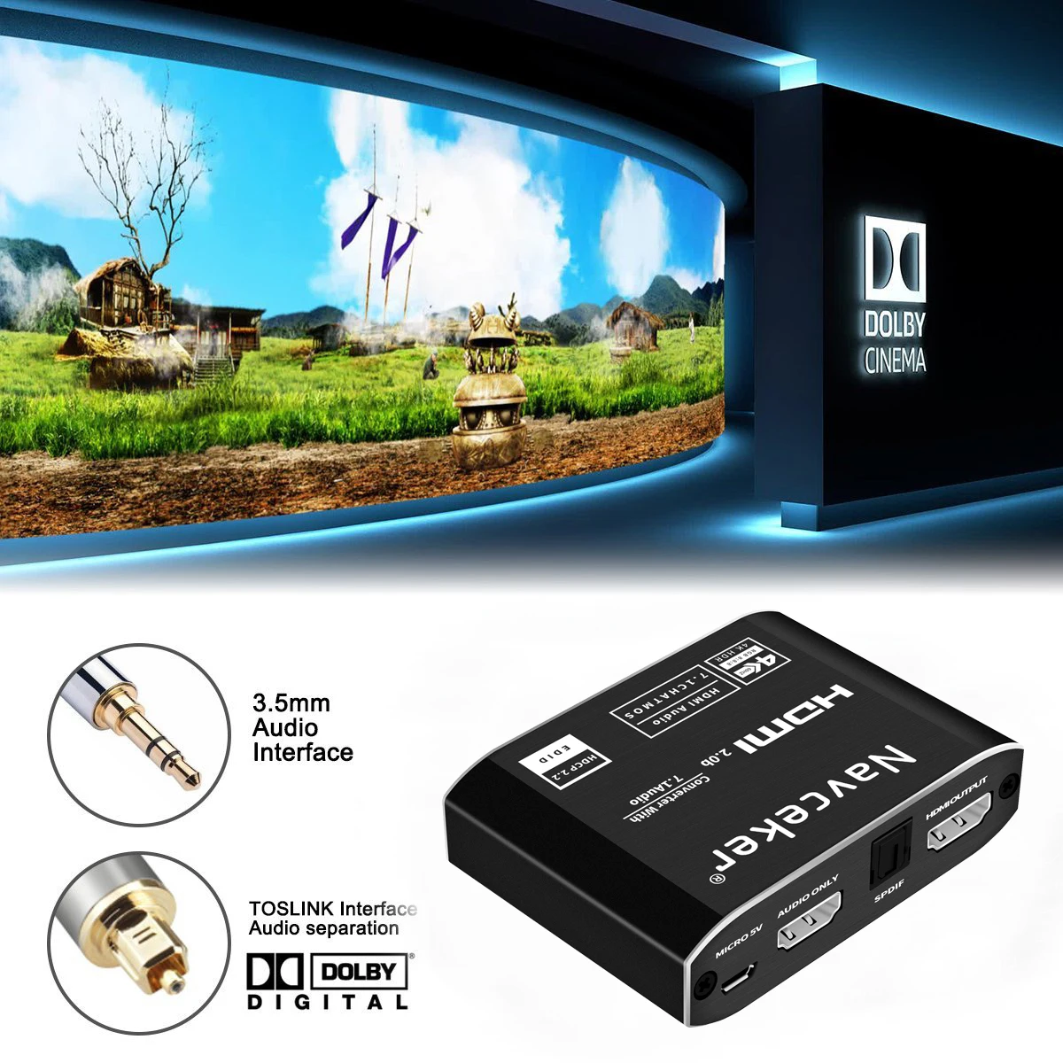 El Extractor de audio Navceker 4K HDMI 2,0 es un interruptor de alto rendimiento de 1 entrada HDMI y 1 salida HDMI con salida de audio. Salida de audio HDMI /Toslink/3,5 mmjack compatible con la función de extracción de audio, el sistema admite todos los formatos de TV 3D además de todos los formatos HDTV hasta 4Kx2K @ 60Hz RGB 8 :8 :8.